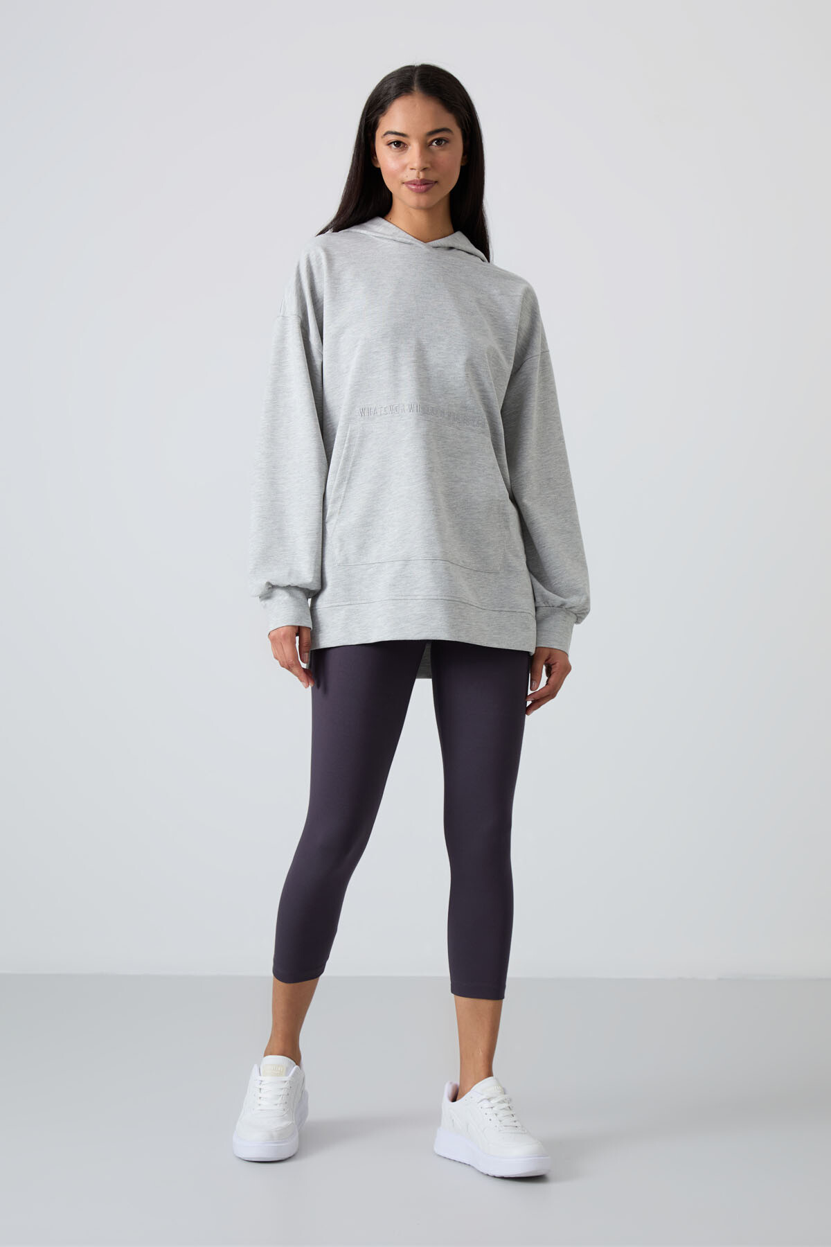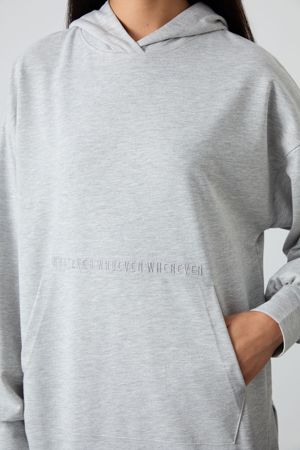 Gri Melanj Balon Kol Yazı Nakışlı Kadın Oversize Tunik Sweatshirt - 97163