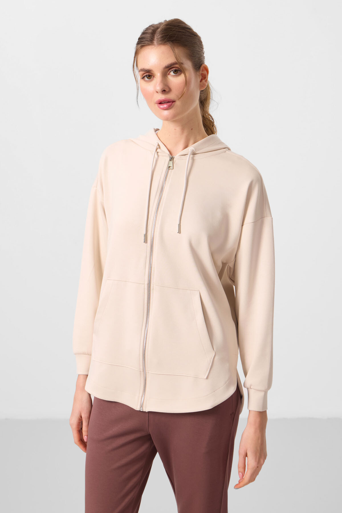 Sade şıklığı ve rahatlığı bir arada sunan bu kapüşonlu tunik sweatshirt, bej tonuyla her kombine uyum sağlar. Oversize kesimi ve yumuşak dokusu, gün boyu konfor sağlarken, kapüşon detayı ekstra koruma sunar. Uzun tunik formu, hem rahat hem de şık bir görünüm yaratır. Hem spor hem de gündelik şıklığınızı tamamlayacak bu sweatshirt, gardırobunuzun vazgeçilmez parçalarından biri olacak.