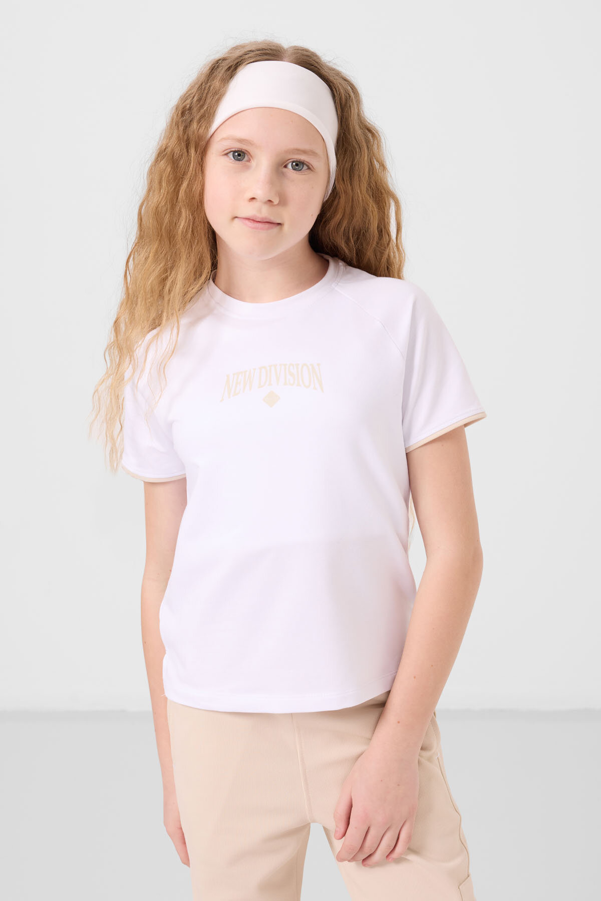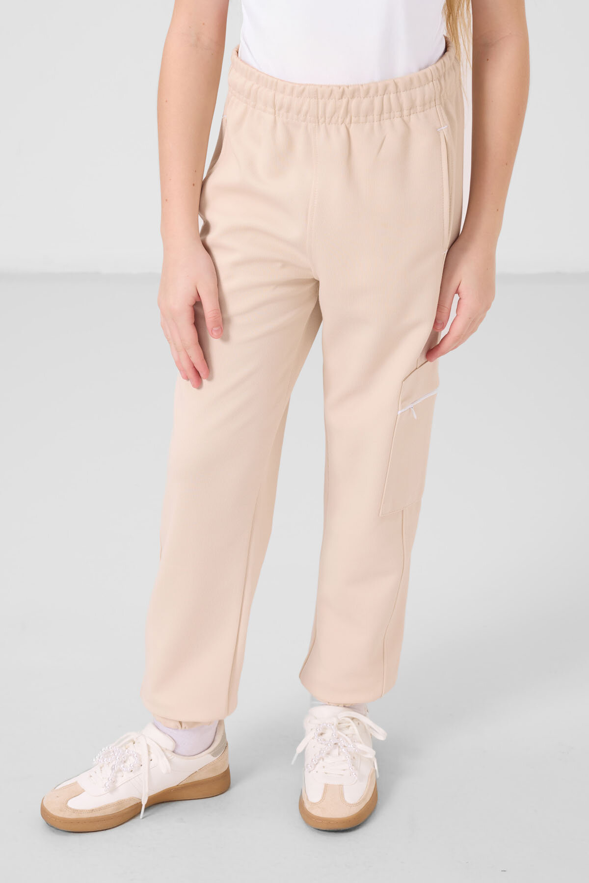 Beyaz-Bej O Yaka Baskılı Lastik Paça Kargo Cepli Kız Çocuk Eşofman Takım - 75173