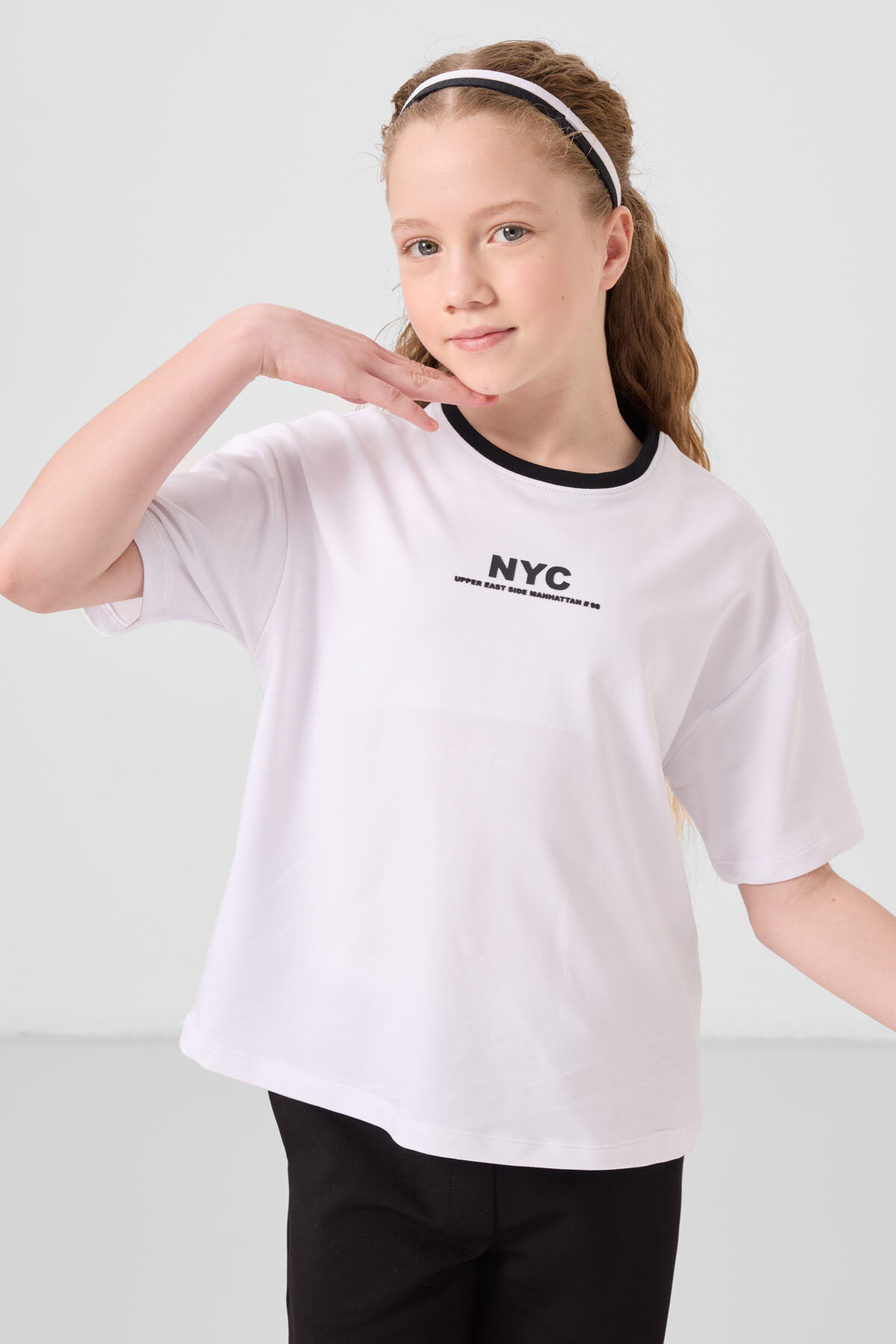 Beyaz-Siyah O Yaka Baskılı Geniş Paça Standart Fit Kız Çocuk Palazzo Eşofman Takım - 75171