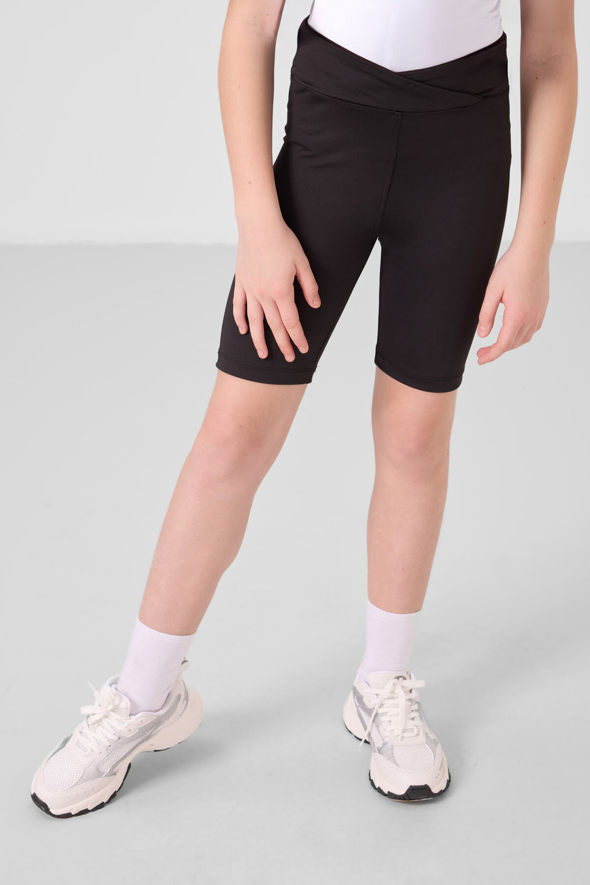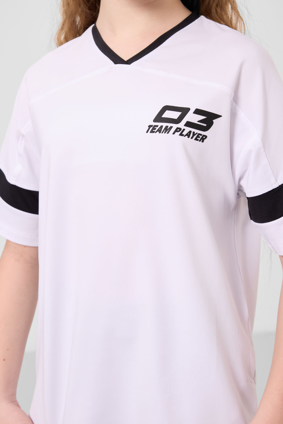 Beyaz-Siyah V Yaka Kemer Detaylı Standart Fit Performans Kız Çocuk Tayt Takım - 75187