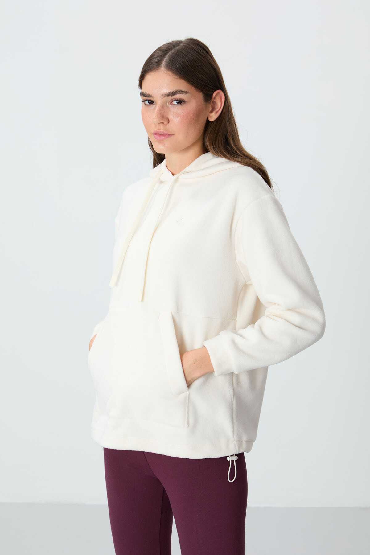 Ekru Kalın Yumuşak Dokulu Kapüşonlu Oversize Nakışlı Polar Kadın Sweatshirt - 97292