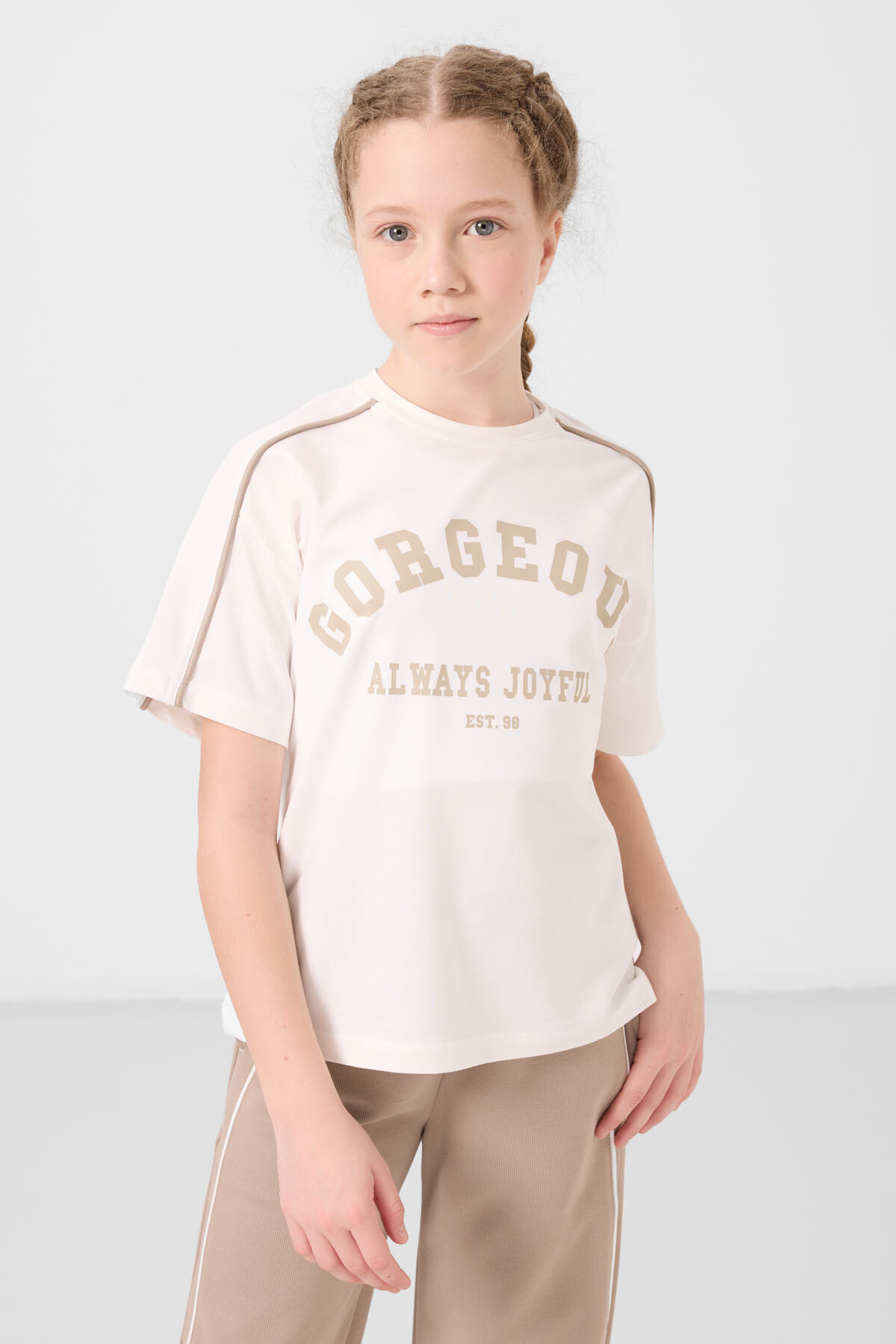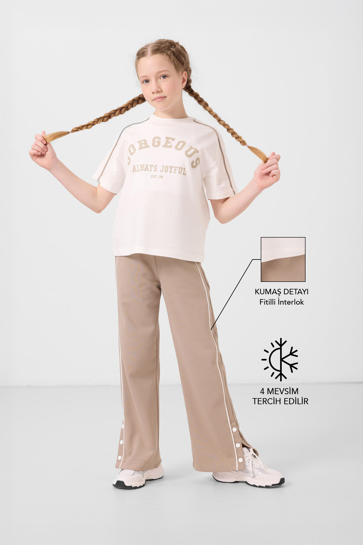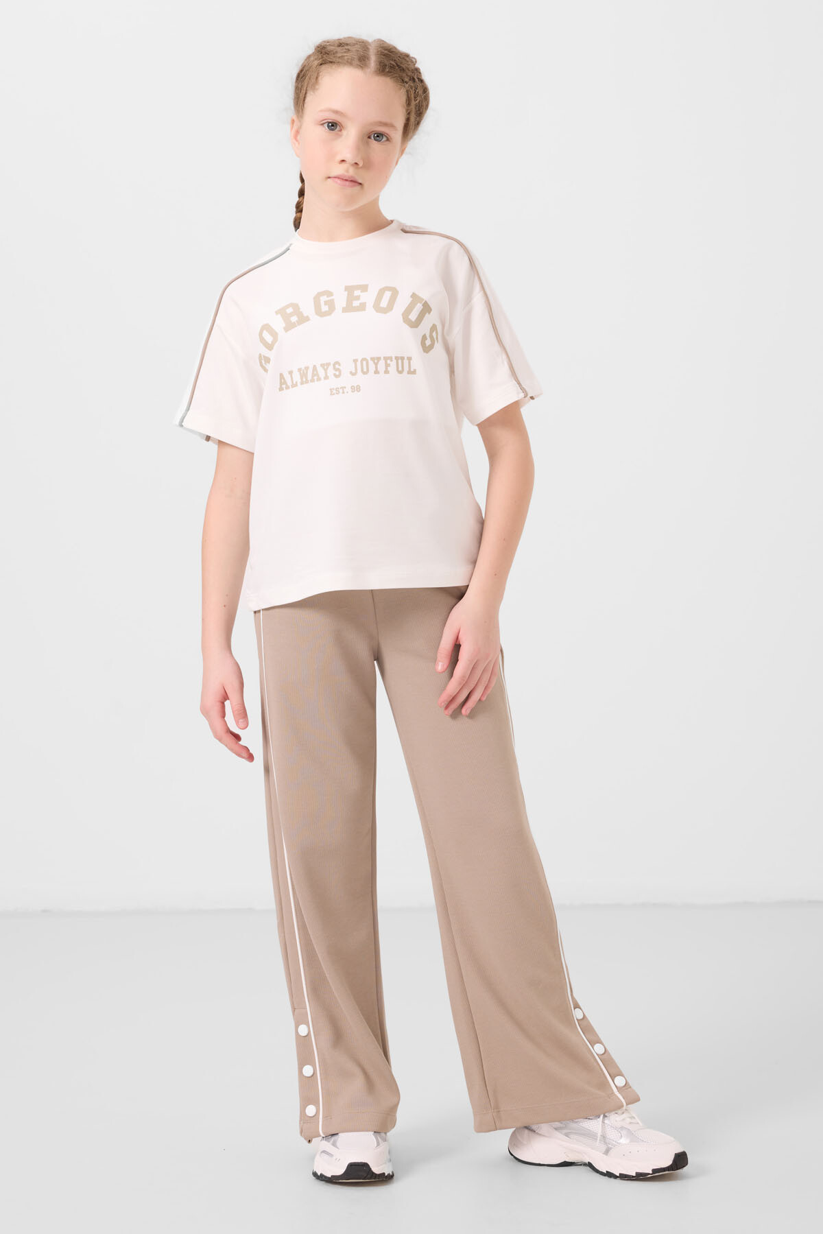 Ekru-Koyu Bej O Yaka Baskılı Geniş Paça Çıt Çıt Detaylı Kız Çocuk Palazzo Eşofman Takım - 75172