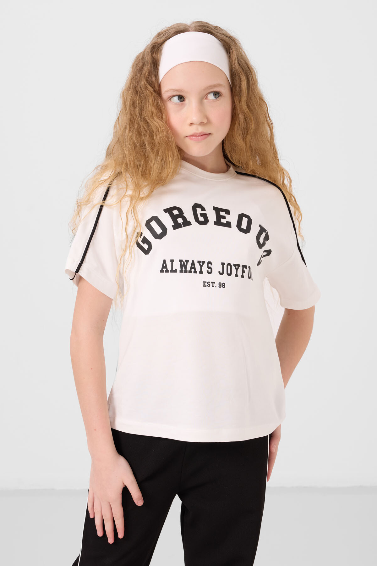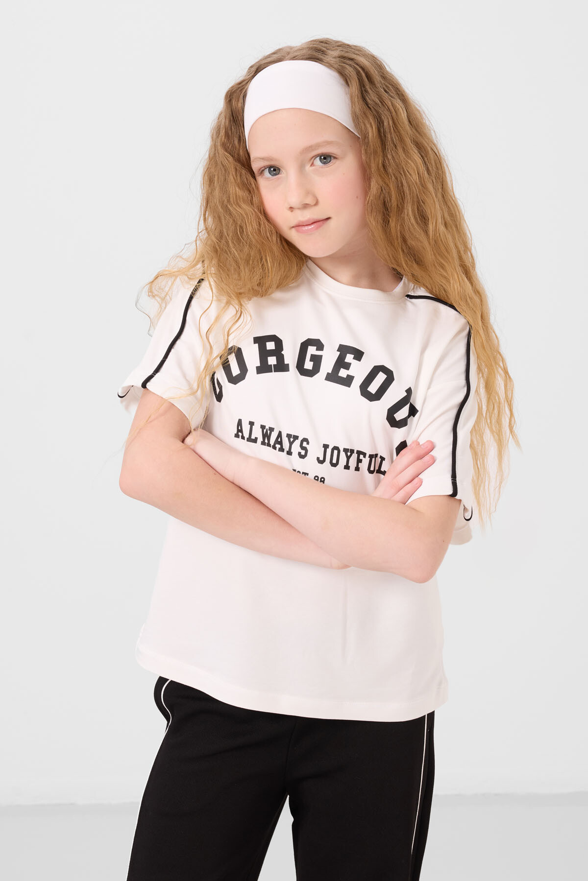 Ekru-Siyah O Yaka Baskılı Geniş Paça Çıt Çıt Detaylı Kız Çocuk Palazzo Eşofman Takım - 75172