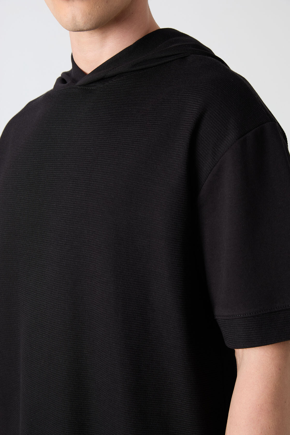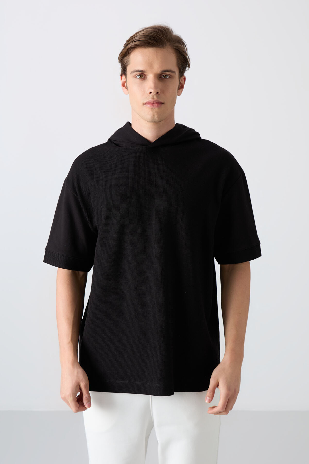 Siyah Pamuklu Kalın Yüzeyi Dokulu Oversize Fit Basic Erkek T-Shirt - 88335