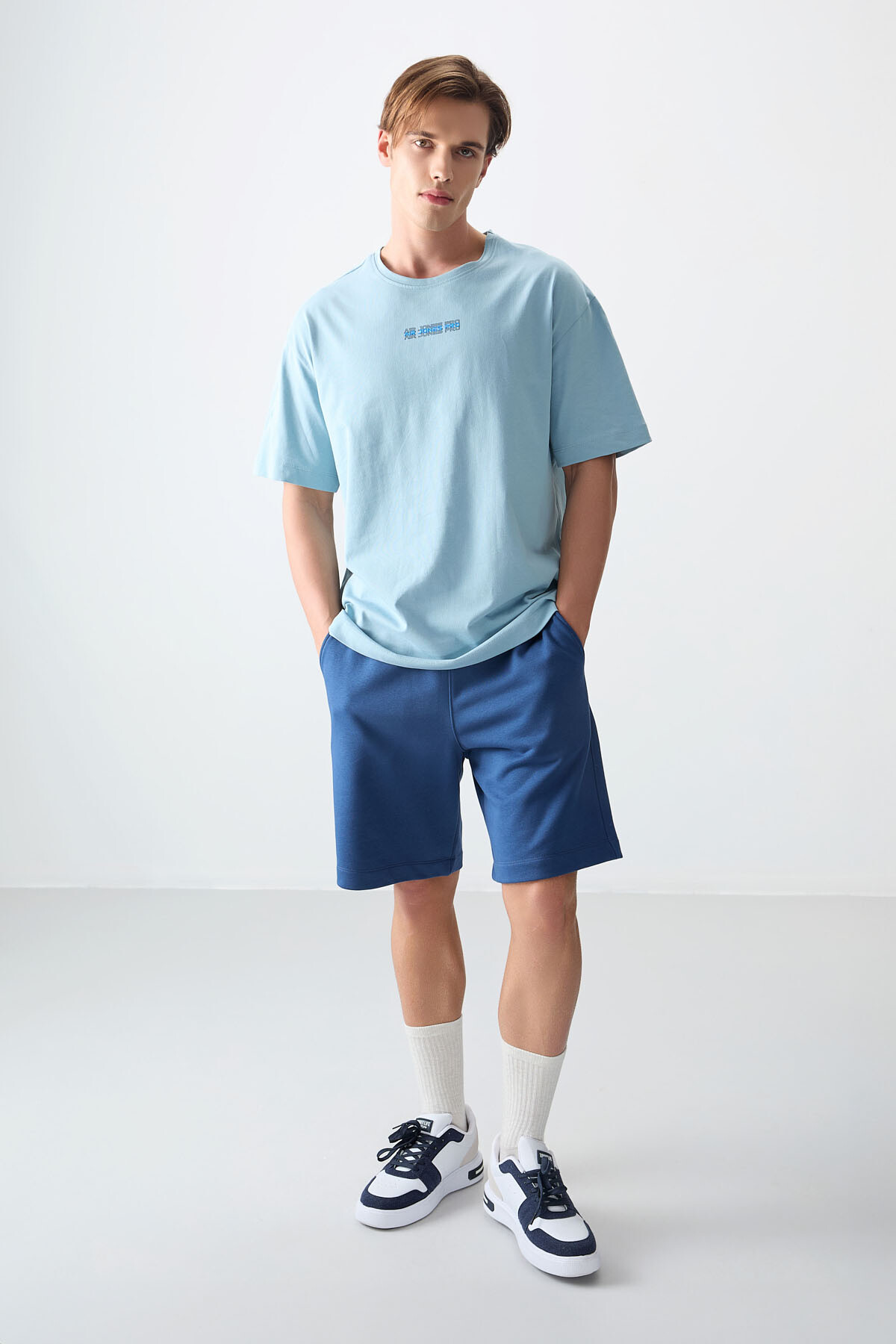 Açık Mavi %100 Pamuk Kalın Yumuşak Dokulu Oversize Fit Baskılı Erkek T-Shirt - 88354