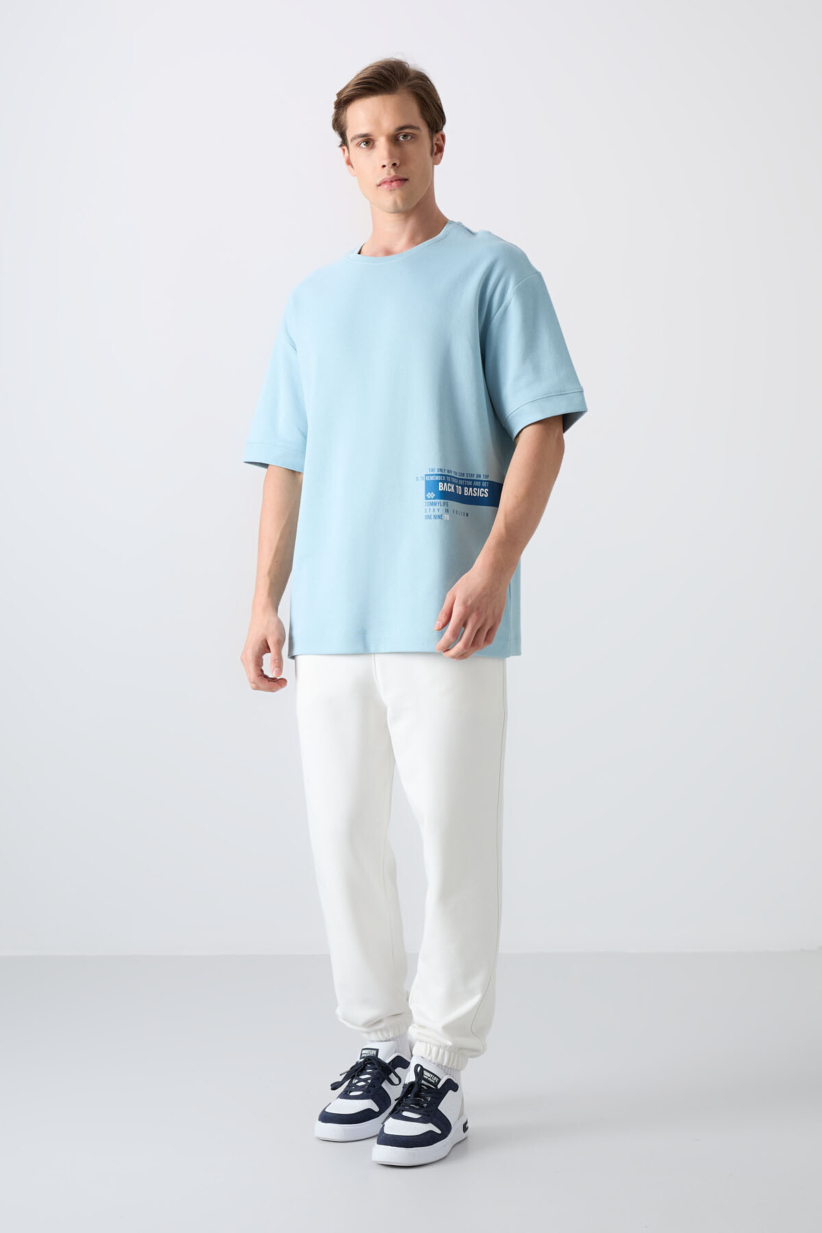 Açık Mavi Pamuklu Kalın Yumuşak Dokulu Oversize Fit Baskılı Erkek T-Shirt - 88322