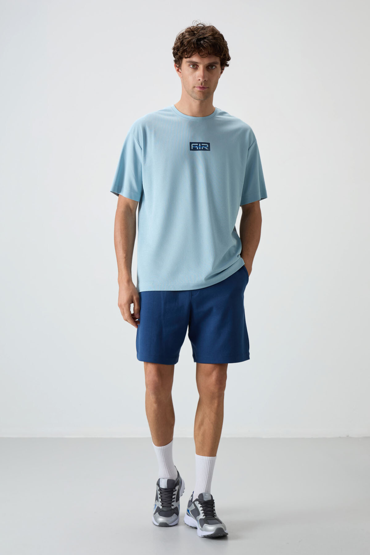 Açık Mavi Pamuklu Kalın Yüzeyi Dokulu Oversize Fit Baskılı Erkek T-Shirt - 88367