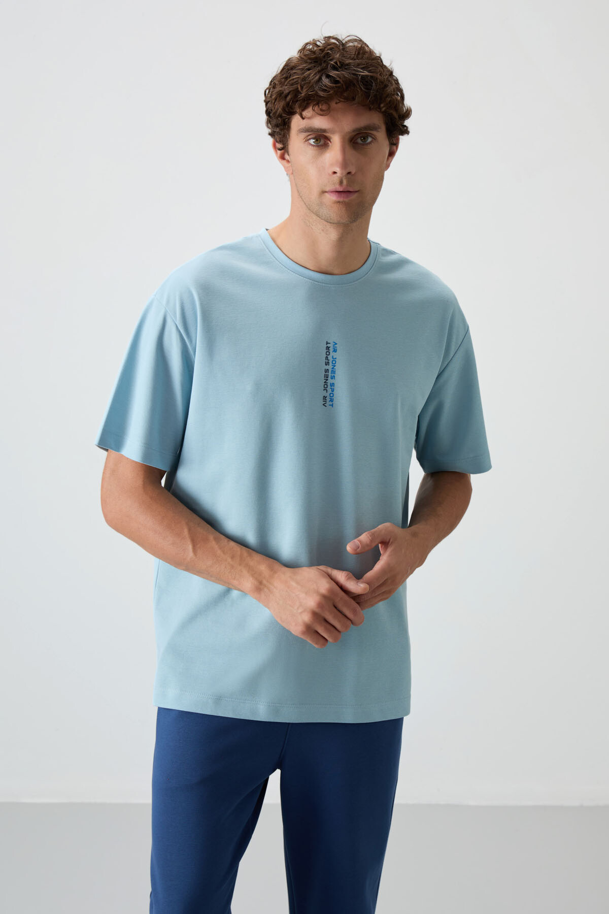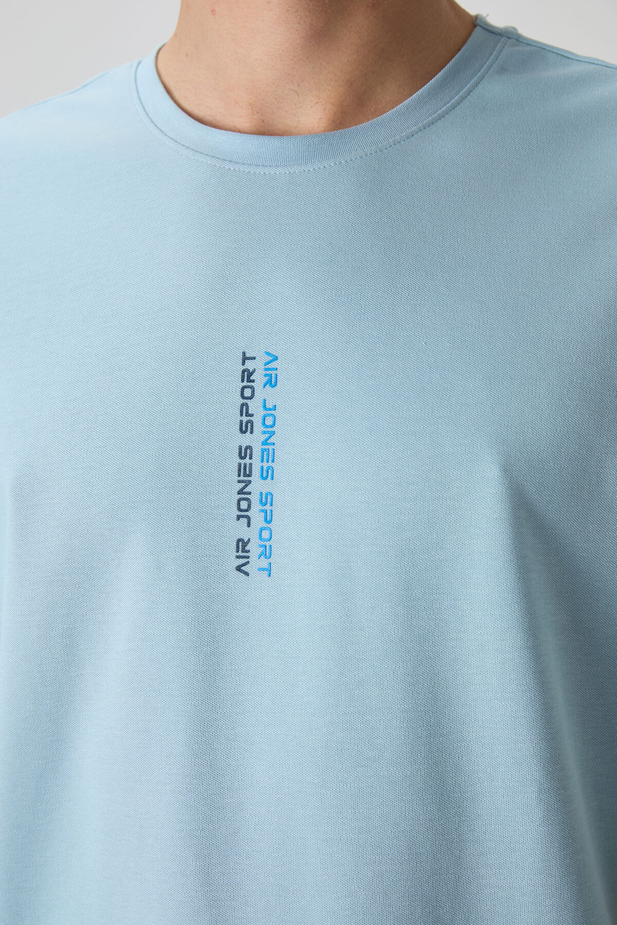 Açık Mavi Pamuklu Kalın Yüzeyi Dokulu Oversize Fit Baskılı Erkek T-Shirt - 88368