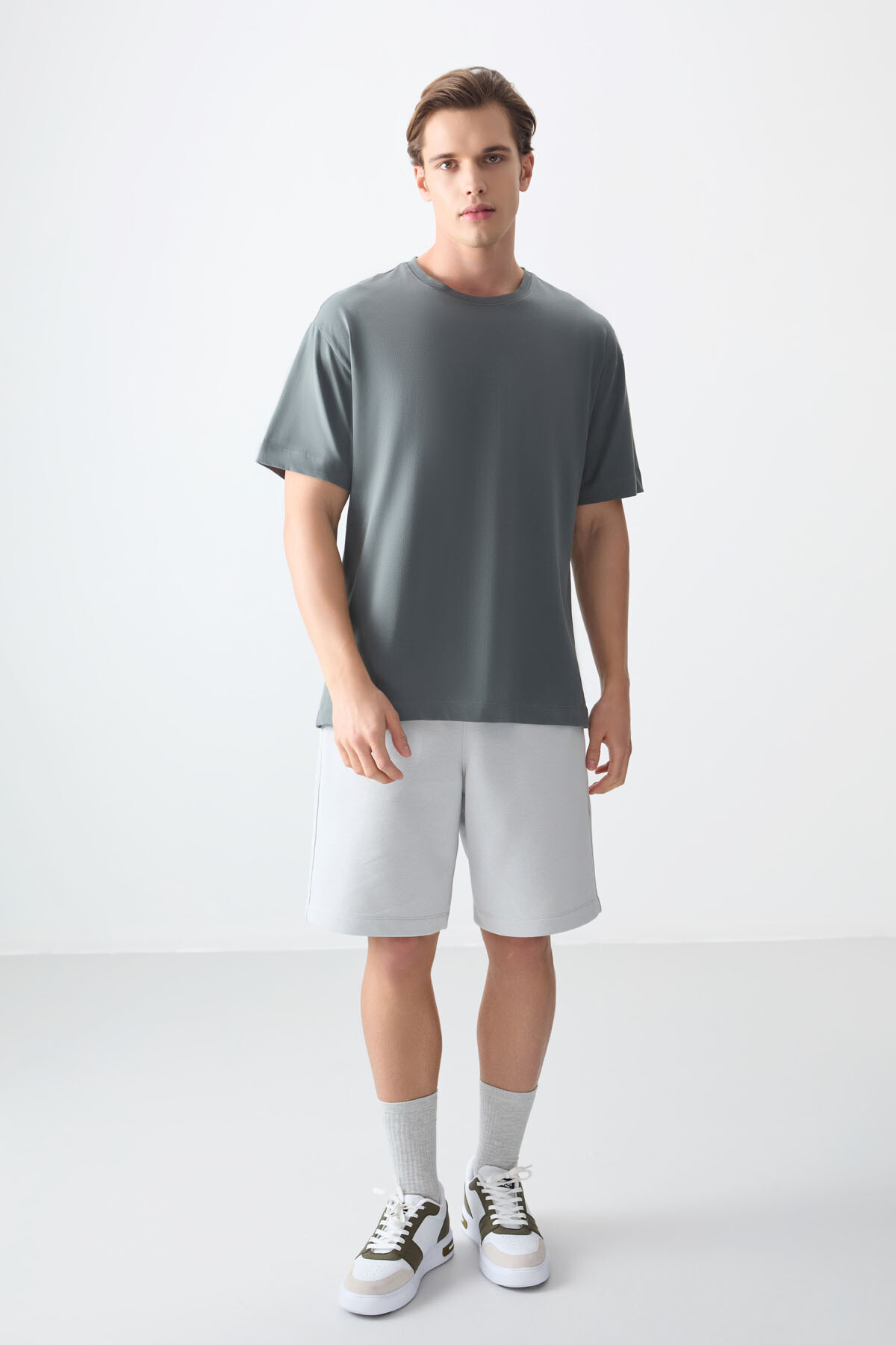 Haki %100 Pamuk Kalın Yumuşak Dokulu Oversize Fit Basic Erkek T-Shirt - 88353