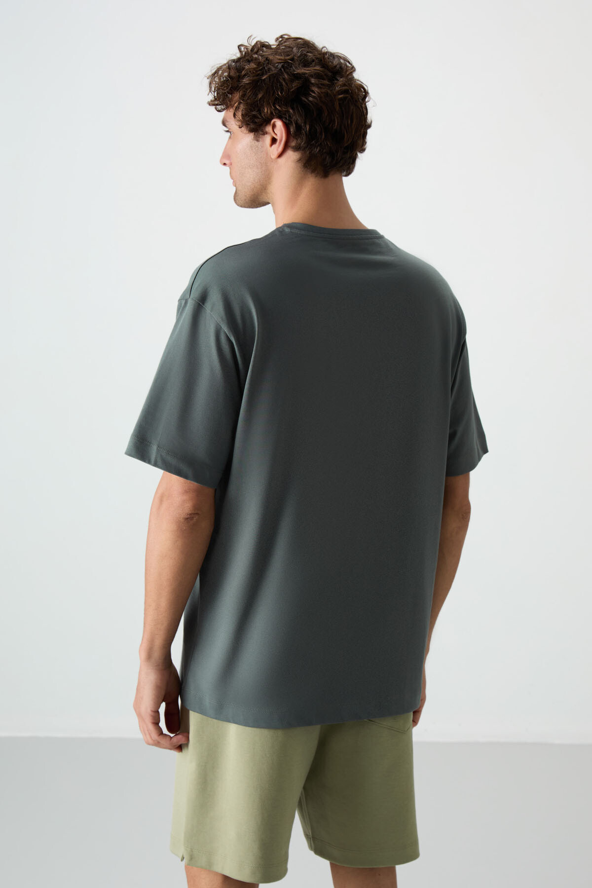 Haki Pamuklu Kalın Yumuşak Dokulu Oversize Fit Baskılı Erkek T-Shirt - 88373