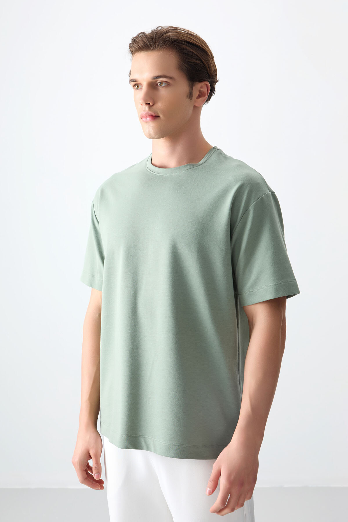 Açık Yeşil Pamuklu Kalın Yumuşak Dokulu Oversize Fit Basic Erkek T-Shirt - 88377