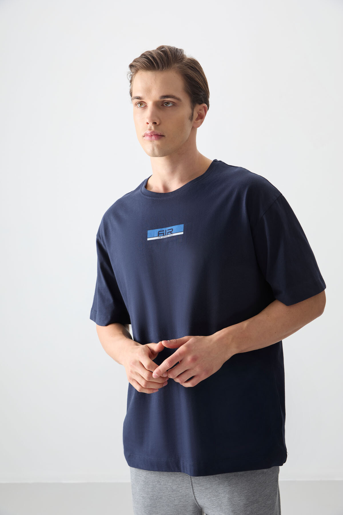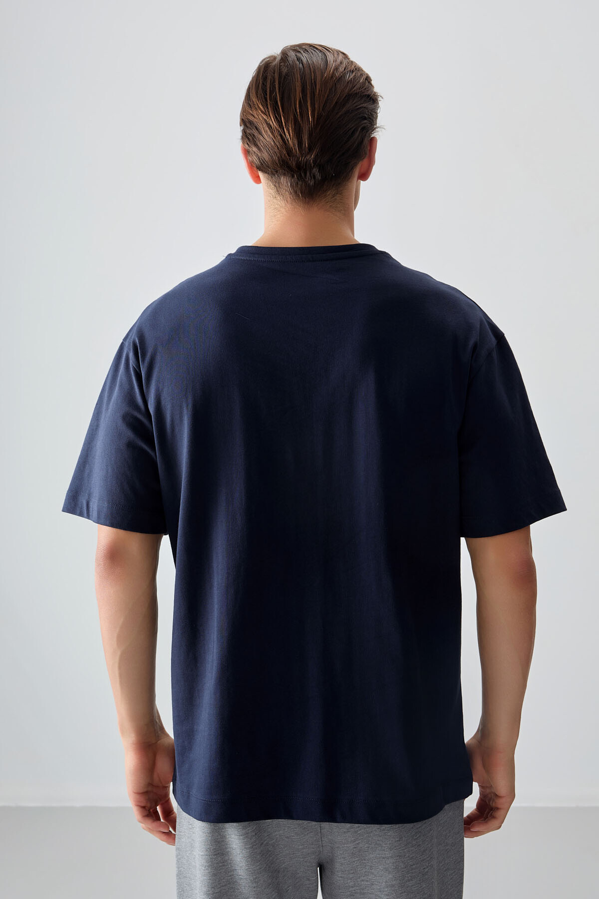 Lacivert %100 Pamuk Kalın Yumuşak Dokulu Oversize Fit Baskılı Erkek T-Shirt - 88359