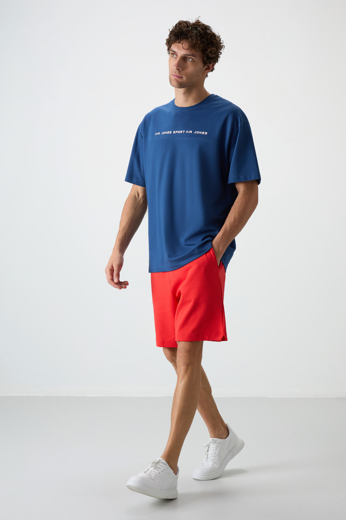 Petrol Mavi Pamuklu Kalın Yumuşak Dokulu Oversize Fit Baskılı Erkek T-Shirt - 88375