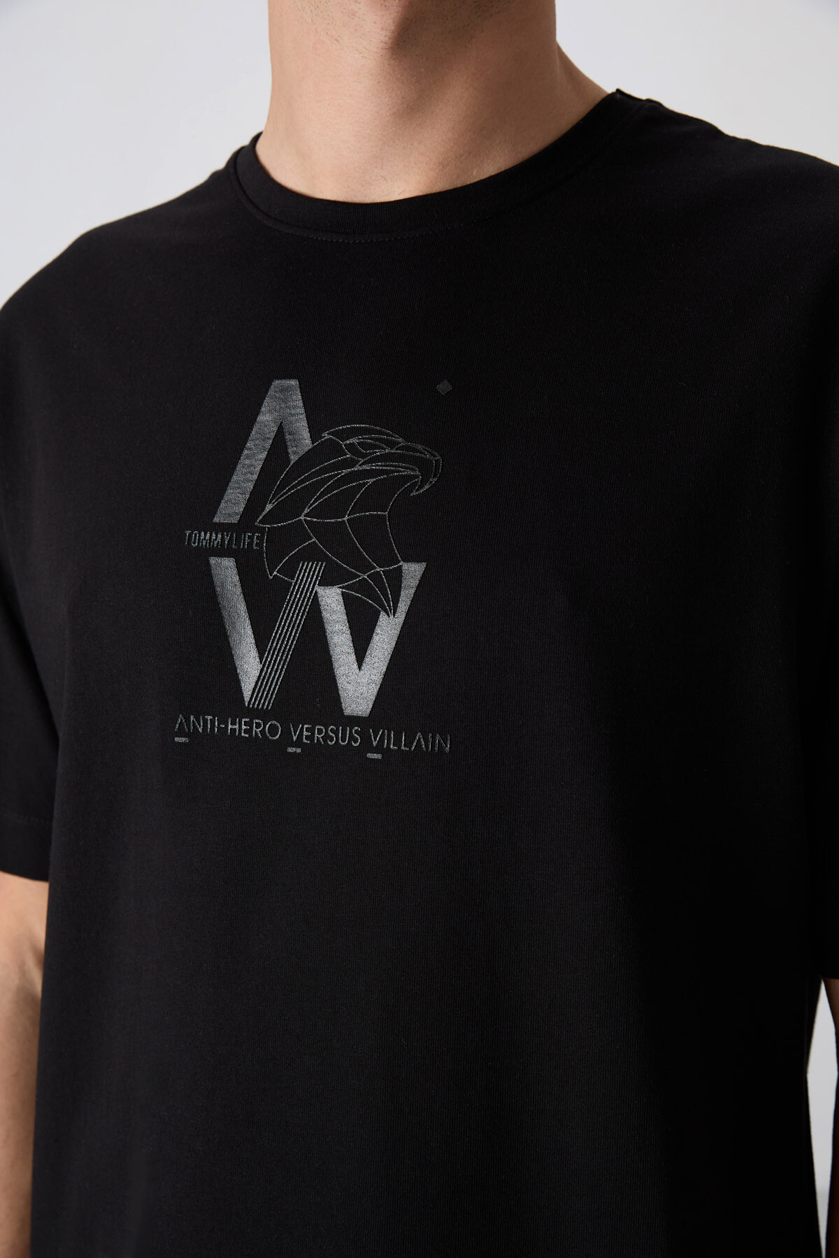 Siyah Pamuklu Kalın Yumuşak Dokulu Oversize Fit Baskılı Erkek T-Shirt - 88332