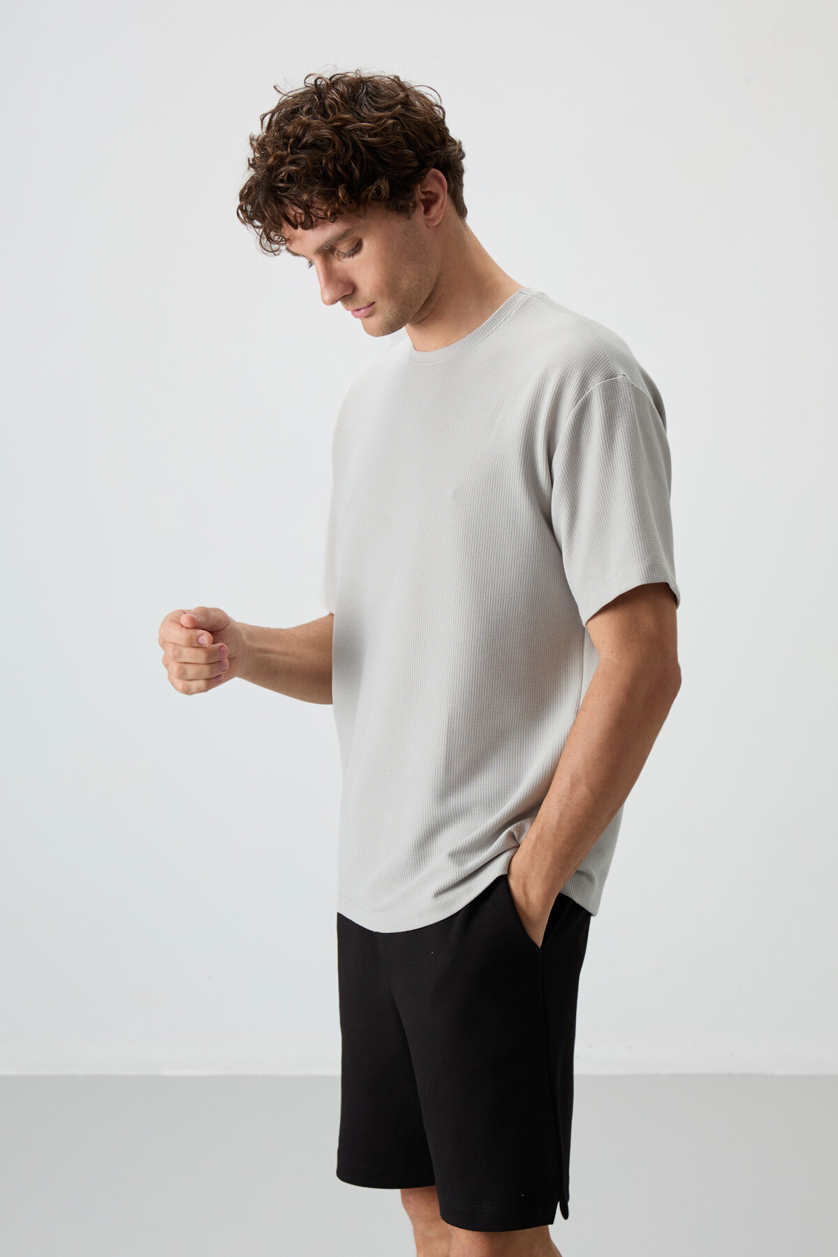 Taş Waffle İnterlok Yüzeyi Dokulu Oversize Fit Basic Erkek T-Shirt - 88379