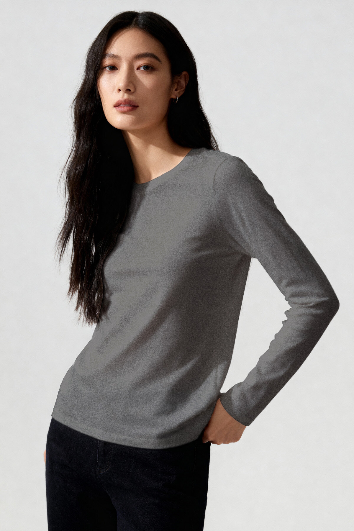 Gri Melanj O Yaka Standart Fit Uzun Kollu Basic Kadın T-Shirt - 97312