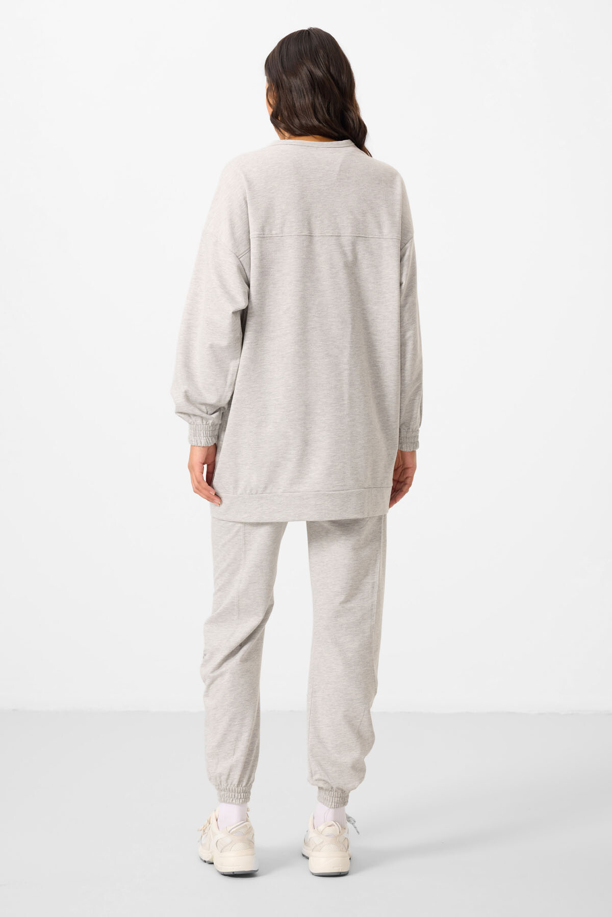 Gri melanjın sade ve yumuşak havası, bu oversize takımda rahatlıkla birleşiyor. Minimal tasarımıyla hem spor hem de şehir şıklığını yakalayabilir, her ortamda konforun tadını çıkarabilirsiniz. Zarif bir sadelikle stiliniz hep ön planda!