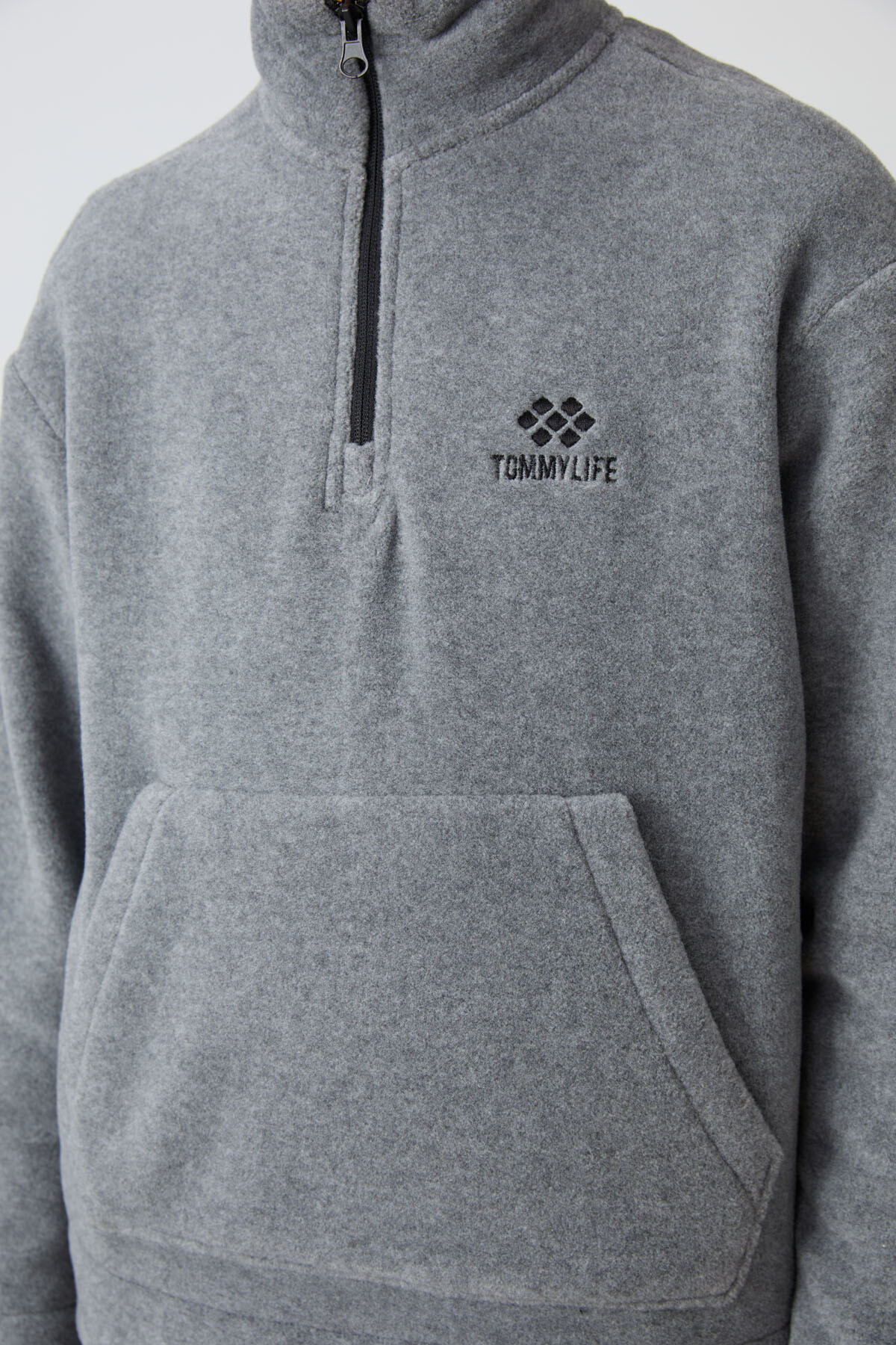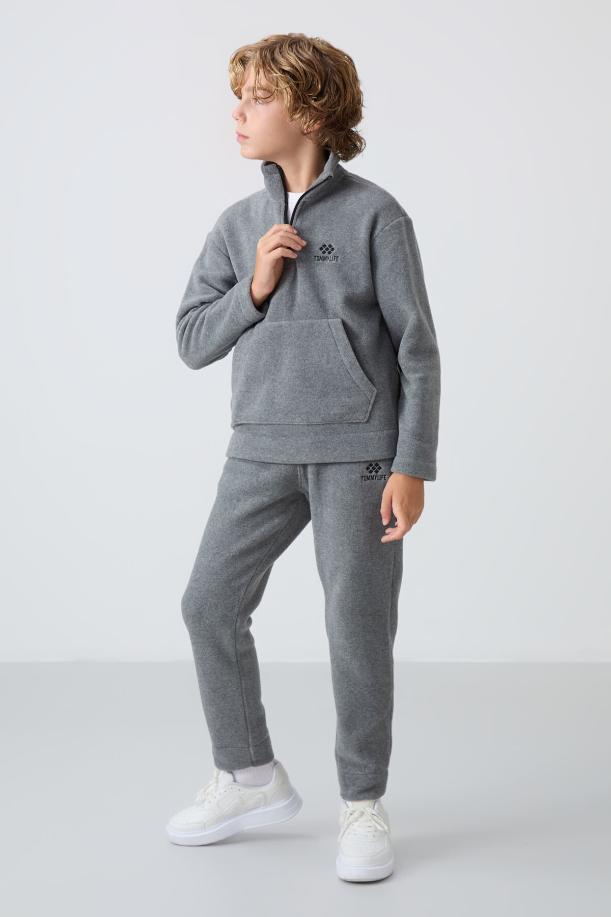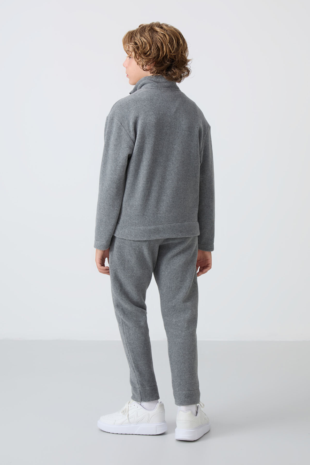 Gri Melanj Kalın Yumuşak Dokulu Standart Fit Nakışlı Polar Erkek Çocuk Eşofman Takım - 11218