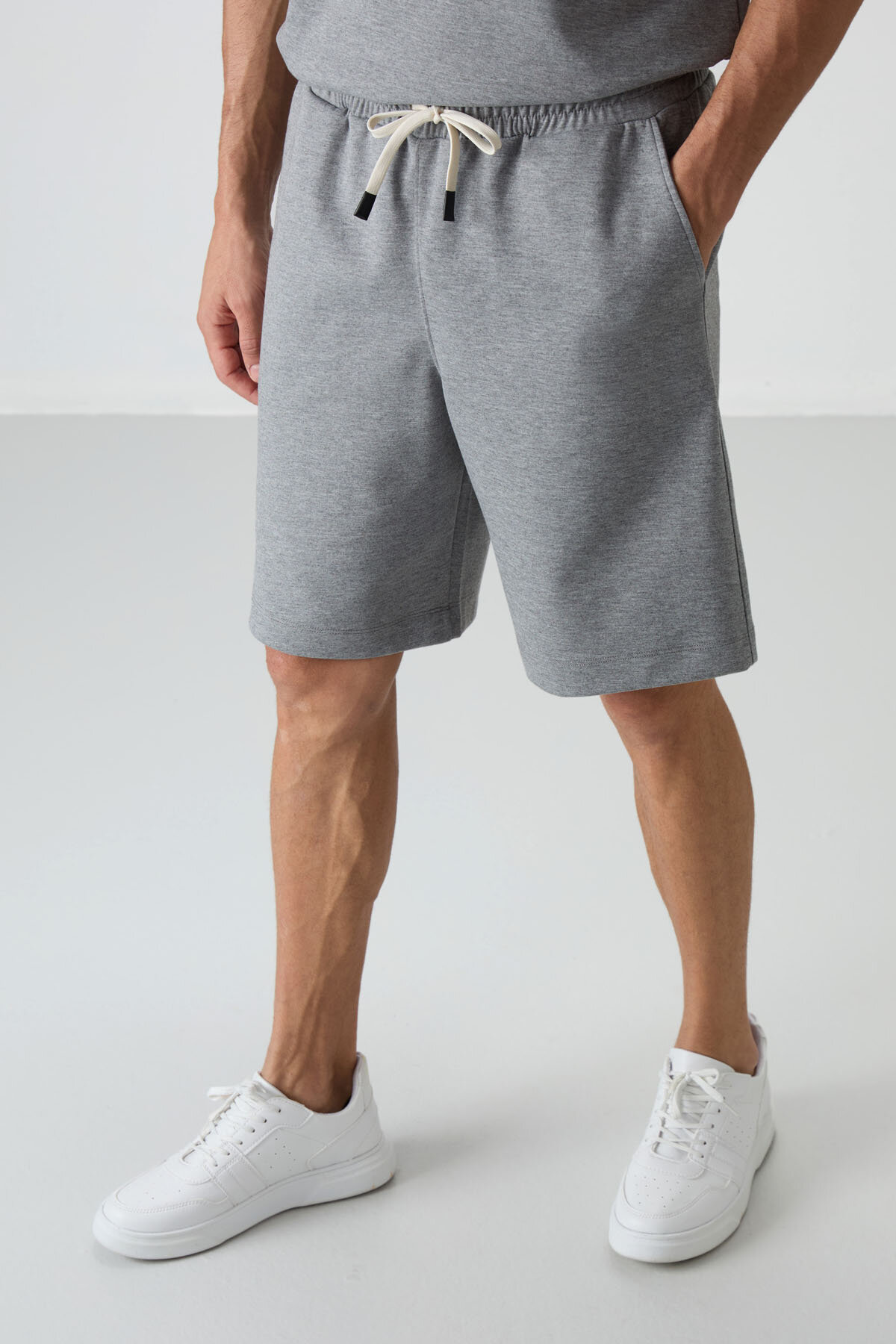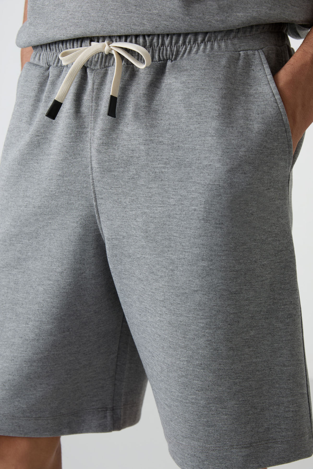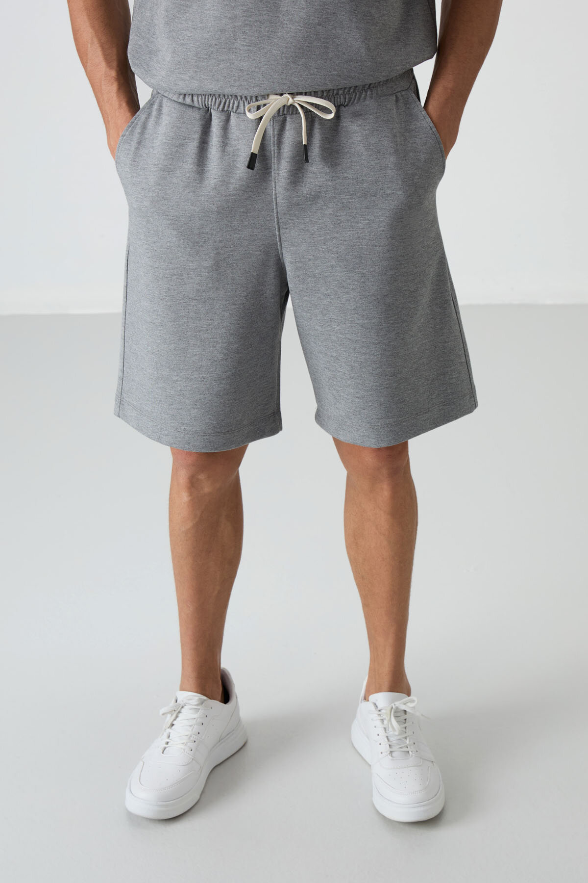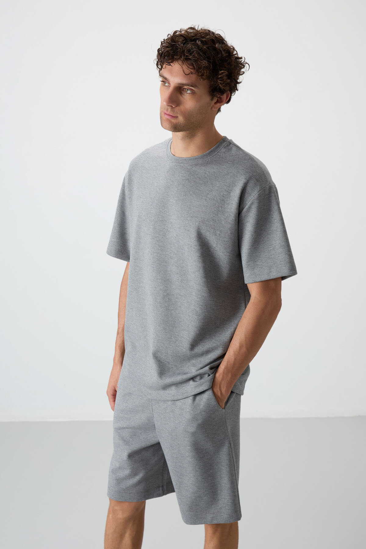 Gri Melanj Oversize Fit Basic Erkek Şort Takım - 85292
