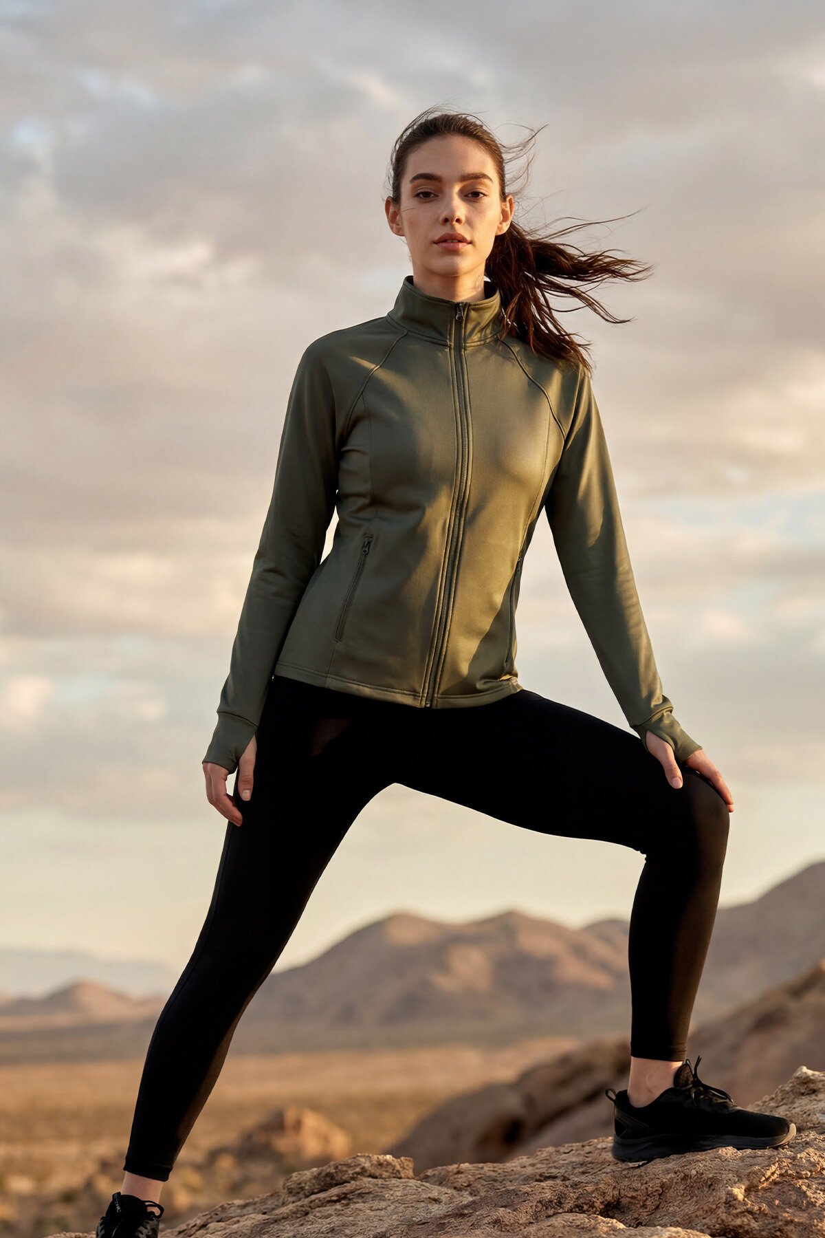 Haki Fermuarlı Dik Yaka Basic Rahat Form Kadın Koşu Ceketi - 97310