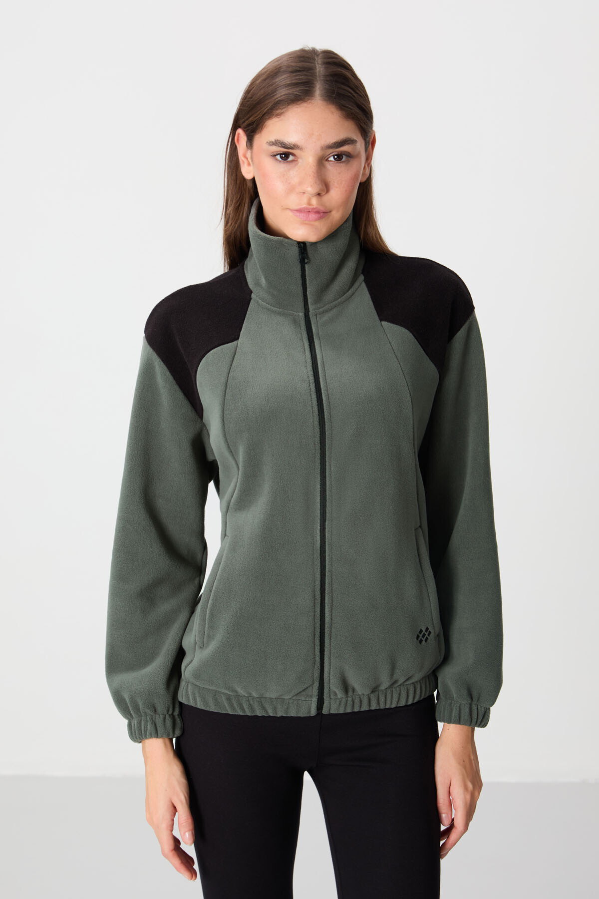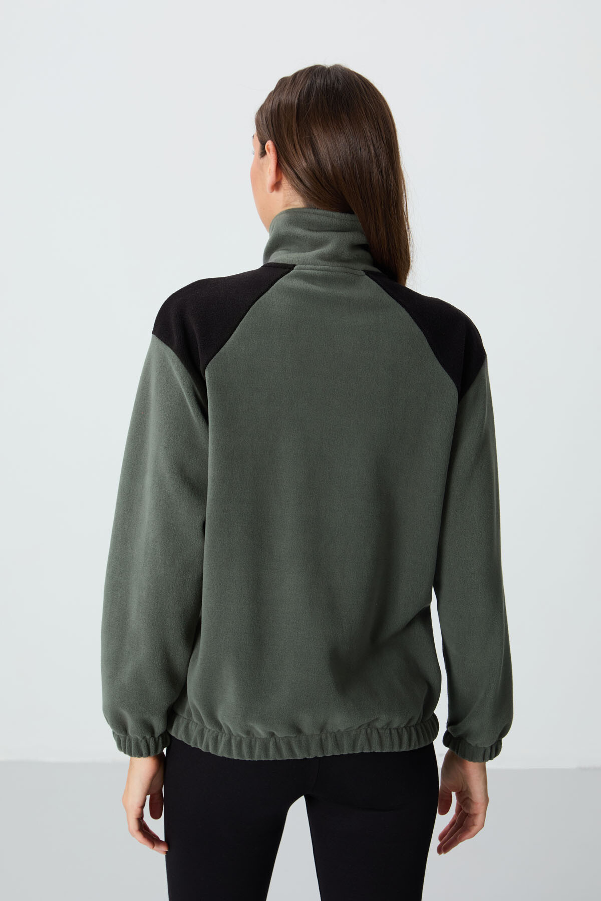 Haki Kalın Yumuşak Dokulu Dik Yaka Oversize Nakışlı Polar Kadın Sweatshirt - 97293