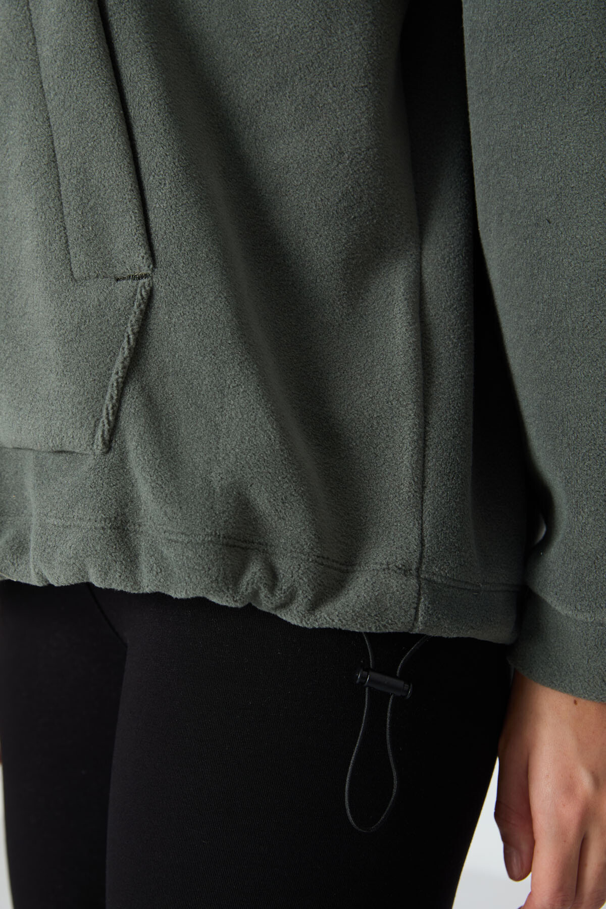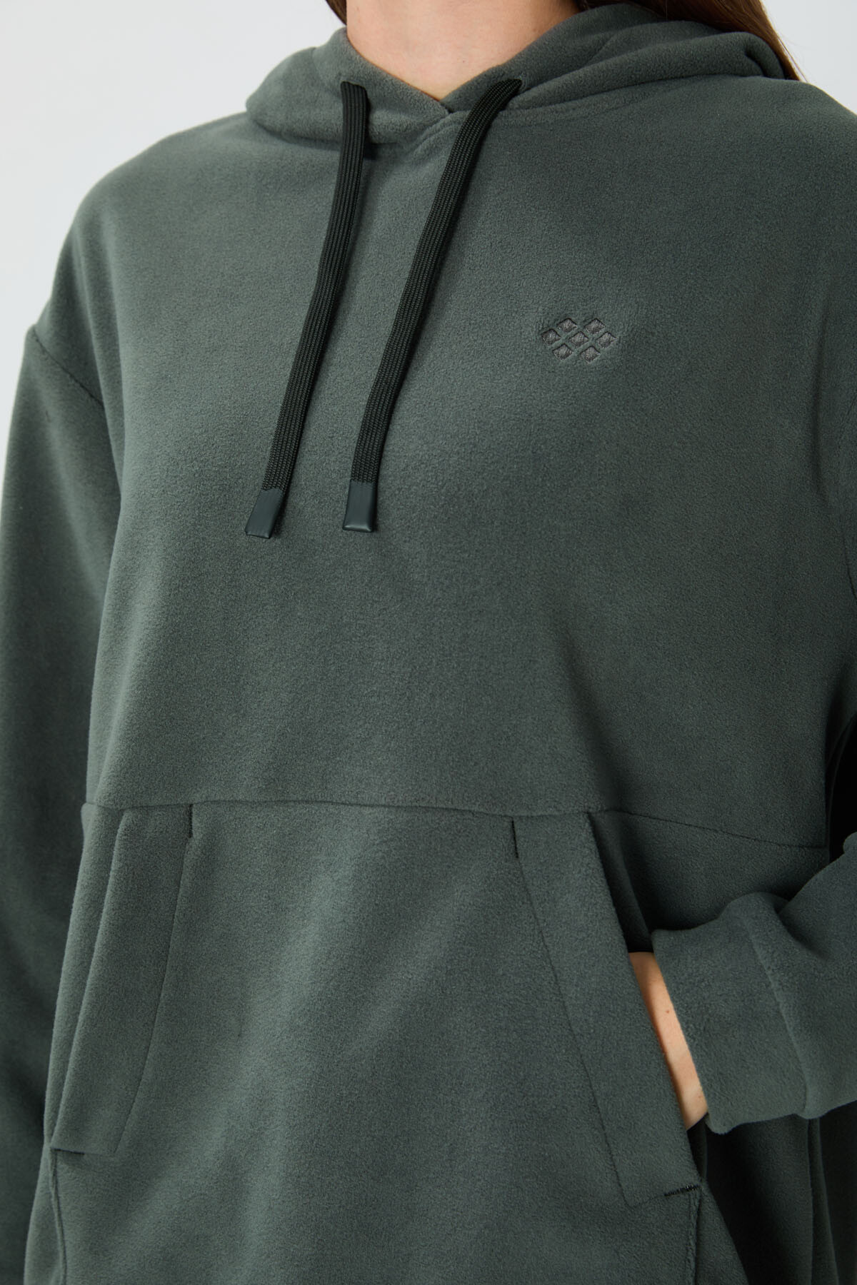 Haki Kalın Yumuşak Dokulu Kapüşonlu Oversize Nakışlı Polar Kadın Sweatshirt - 97292