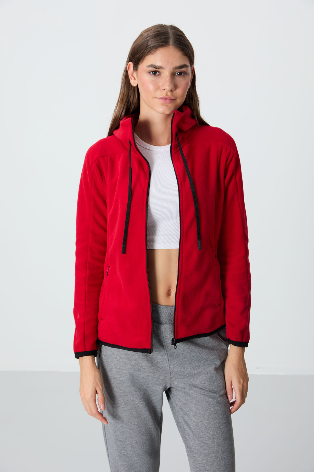 Kırmızı Kalın Yumuşak Dokulu Kapüşonlu Standart Fit Nakışlı Polar Kadın Sweatshirt -97287