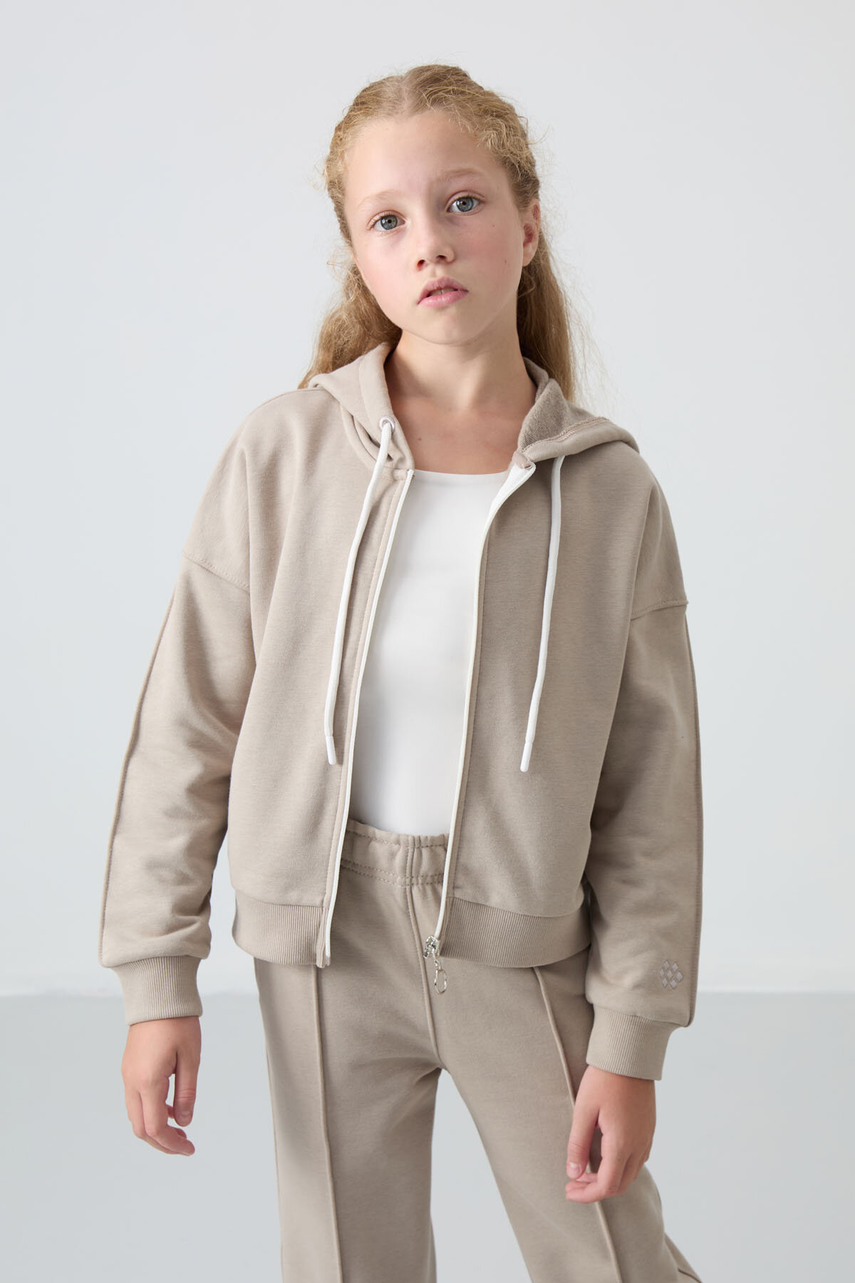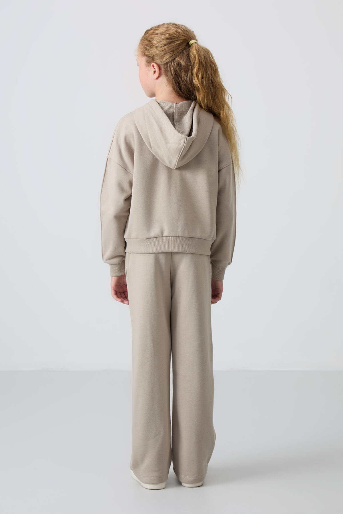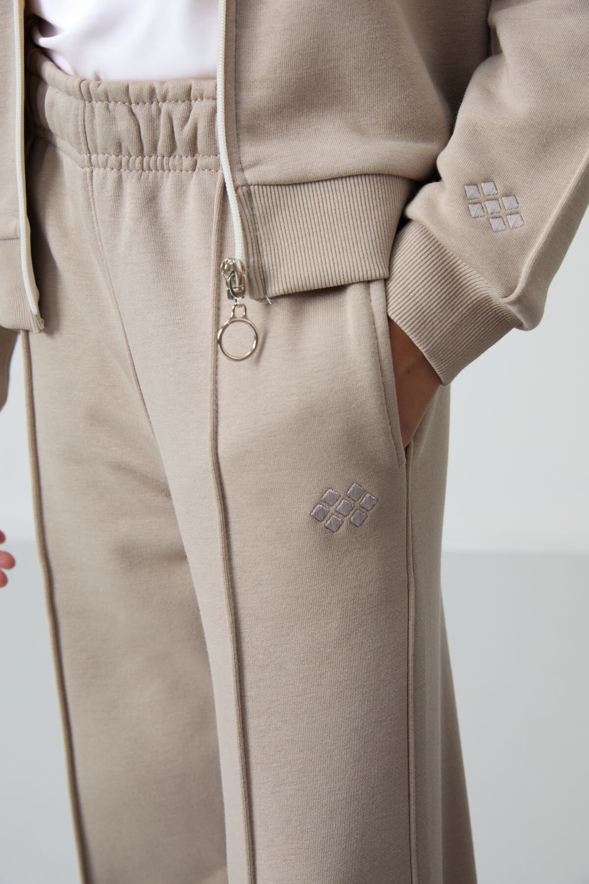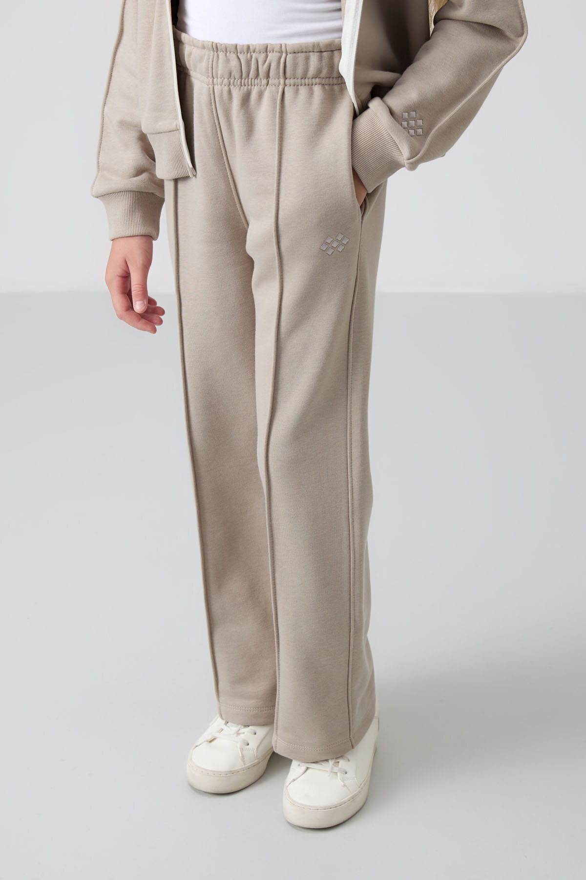 Koyu Bej Pamuklu İçi Tüylü Yumuşak Dokulu Standart Fit Nakışlı Kız Çocuk Eşofman Takım - 75161