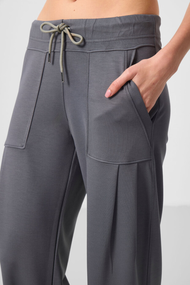 Koyu gri yumuşak dokulu cep detaylı kadın pantolon, şıklığı ve rahatlığı bir araya getiriyor. Yumuşak kumaşı sayesinde gün boyu konfor sağlarken, modern kesimiyle stilinizi tamamlıyor. Önde yer alan büyük cepler pratik kullanım sunarken, bağcıklı beli sayesinde vücuda tam uyum sağlar. Günlük kombinlerden spor görünümlere kadar geniş bir kullanım alanı sunar.