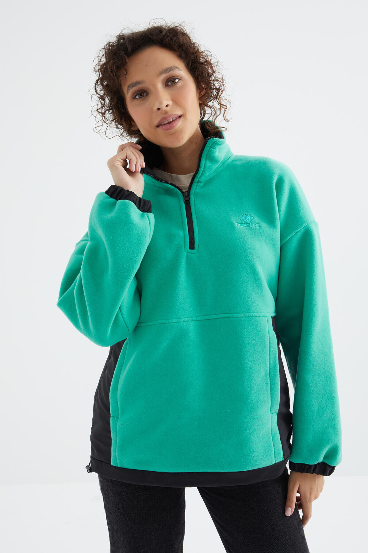 Deniz Yeşili Yarım Fermuar Etek Ucu Büzgülü Dik Yaka Oversize Kadın Polar Sweatshirt dik yakası, etek ucu büzgüsü ve yarım fermuarlı tasarımı ile modaya uyum sağlayan model oversize duruşu ile seninle birlikte mükemmel tarzlara imzasını atmayı bekliyor. Soğuk kış aylarında polar kumaşı ile sıcakları iliklerine kadar hissettiren model jean pantolon, kargo pantolon, jogger pantolon, tayt ve eşofman modelleri ile rahatlıkla kombinlenebilir. Aksesuarlar ile stilini tamamladığında günün her anında değerlendirebilirsin.