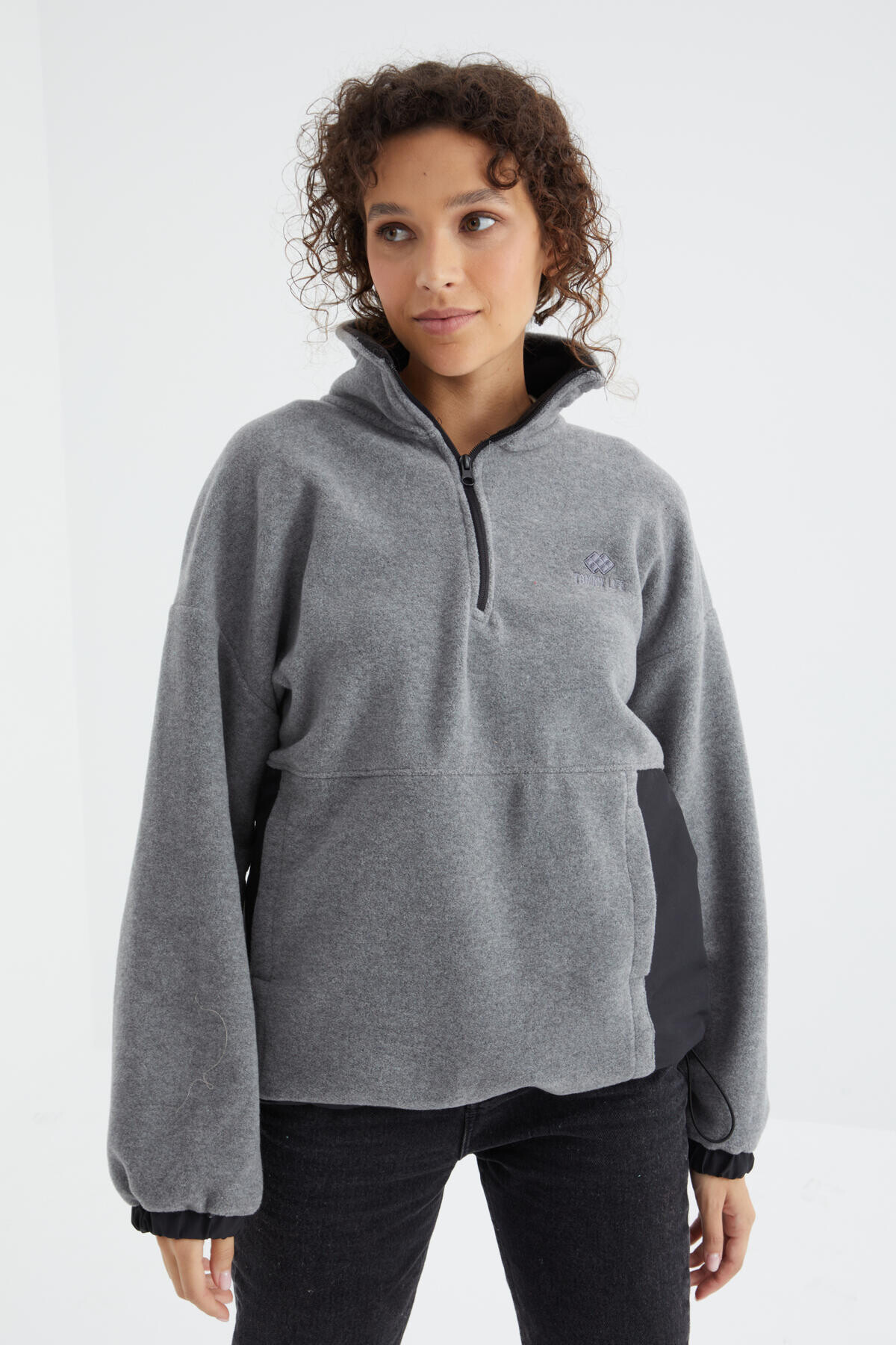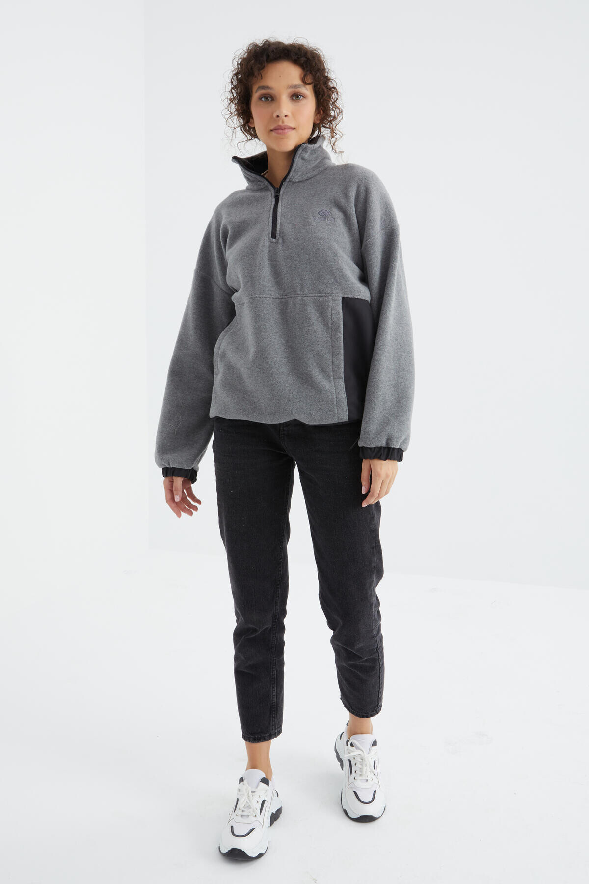 Gri Melanj Yarım Fermuar Etek Ucu Büzgülü Dik Yaka Oversize Kadın Polar Sweatshirt dik yakası, etek ucu büzgüsü ve yarım fermuarlı tasarımı ile modaya uyum sağlayan model oversize duruşu ile seninle birlikte mükemmel tarzlara imzasını atmayı bekliyor. Soğuk kış aylarında polar kumaşı ile sıcakları iliklerine kadar hissettiren model jean pantolon, kargo pantolon, jogger pantolon, tayt ve eşofman modelleri ile rahatlıkla kombinlenebilir. Aksesuarlar ile stilini tamamladığında günün her anında değerlendirebilirsin.
