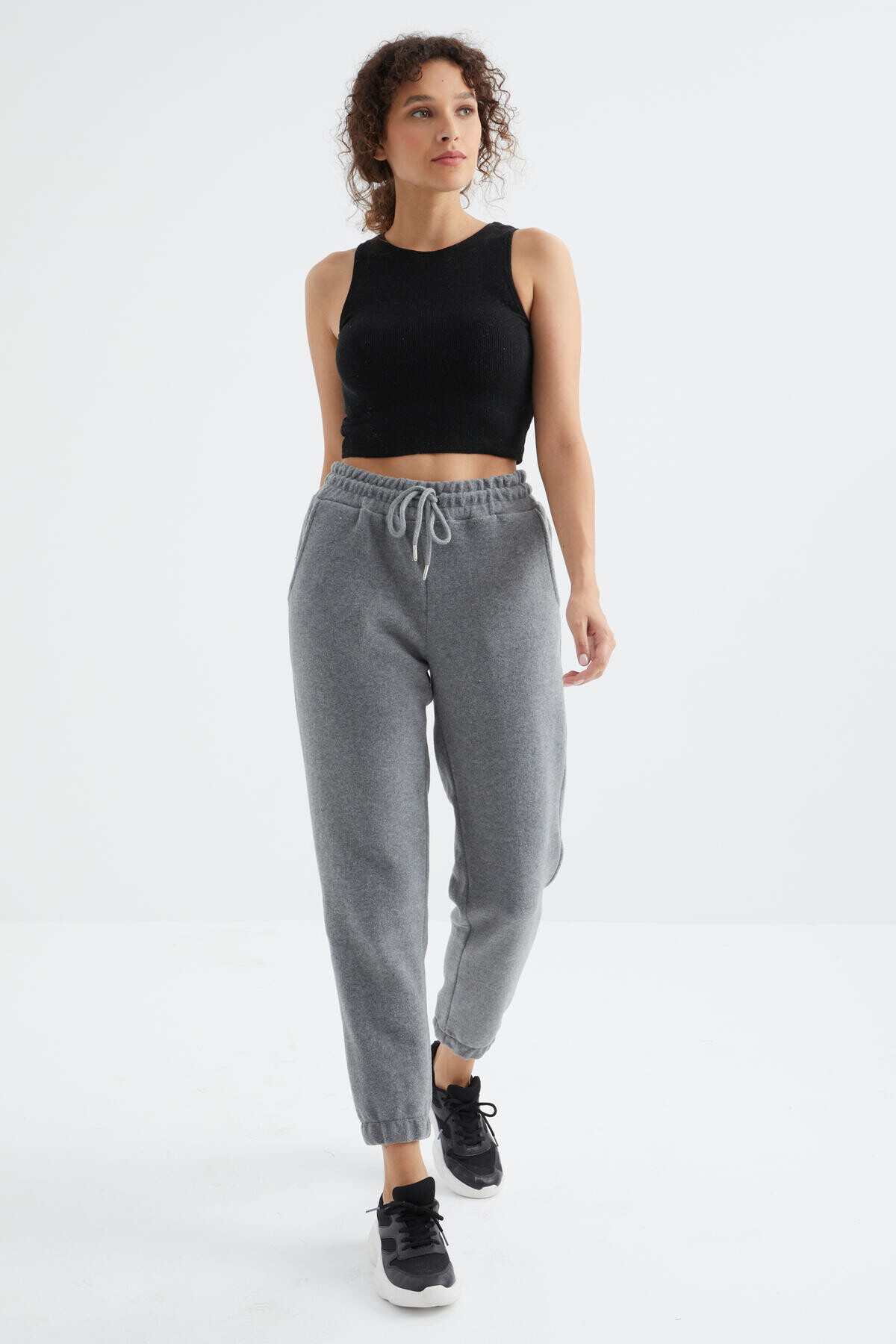Gri Melanj Yüksek Bel Basic Bağcıklı Jogger Polar Kadın Eşofman Alt yüksek bel, bağcıklı, jogger ve basic duruşa sahip olan model polar kumaşı ile seni soğuk kış aylarında sıcak tutacak ve birbirinden farklı stil seçeneği sunacaktır. Üzerinize giyebileceğiniz kapüşonlu sweatshirt modelleri, o yaka swetshirt ve hırka modelleri ile kombinleyebilirsin. Aksesualar ile tamamladığında günün her anında her yere gidebilecek kombininle dikkatleri üzerine sende çek.