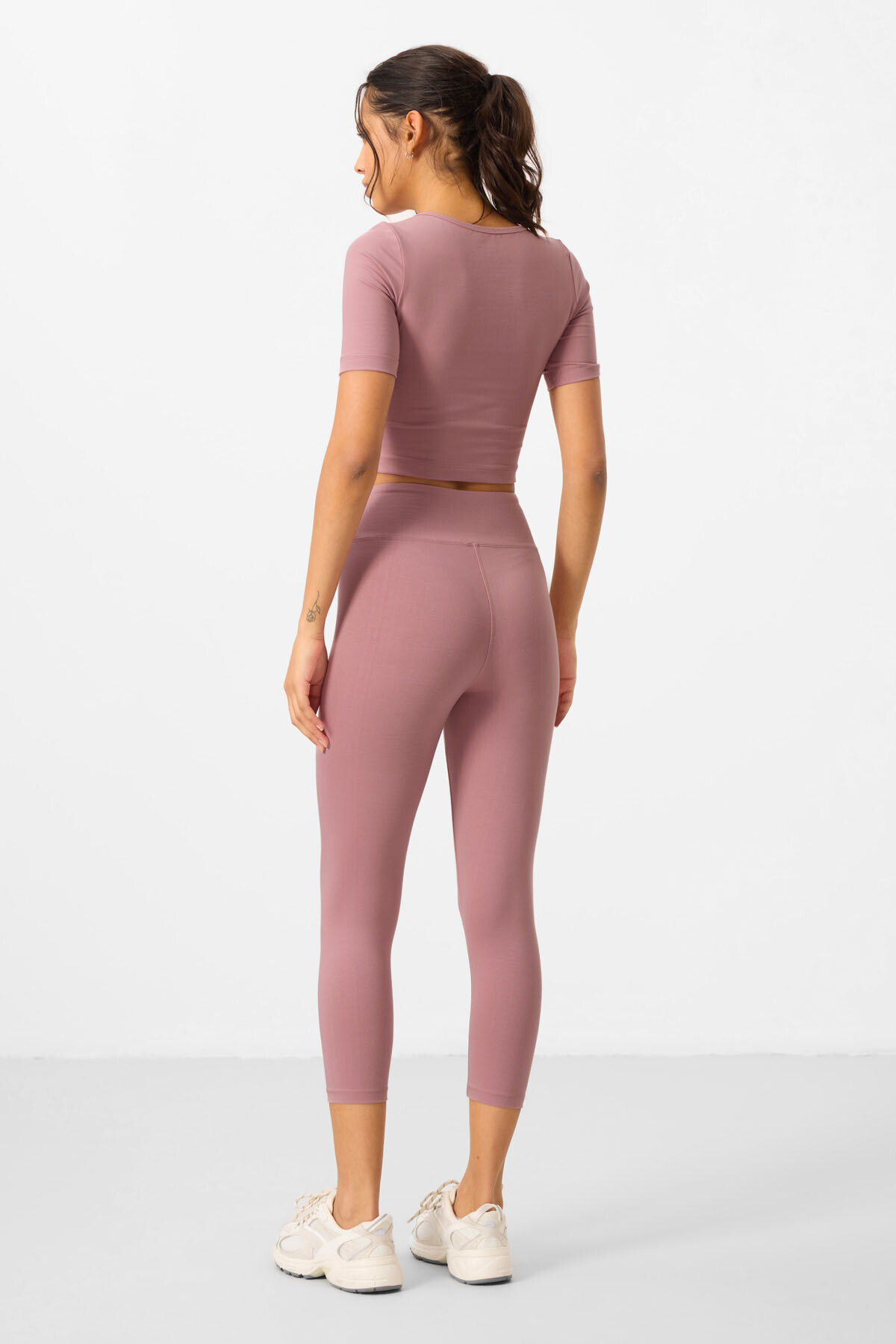 Gül Kurusu Yüksek Bel Kapri-Crop T-Shirt Slim Fit Kadın Tayt Takım, destekleyici ve yumuşak bir yapıya sahiptir. Yüksek bel yapısı ve geniş bel bandı basen bölgesini toparlayarak daha fit bir görünüm elde etmenizi sağlar. Özel olarak tasarlanan tasarım tayt takım pamuklu kumaştan üretilmiştir. Vücudu sararak daha esnek hareket etmenizi sağlar. Kapri model Tayt ve crop t-shirt top logo detayı ile dikkat çekiyor. Sol bel kısmında bulunan minimal logo bulunan üst, alt kapri tayt parça ayrıntıları ile tamamlanır.