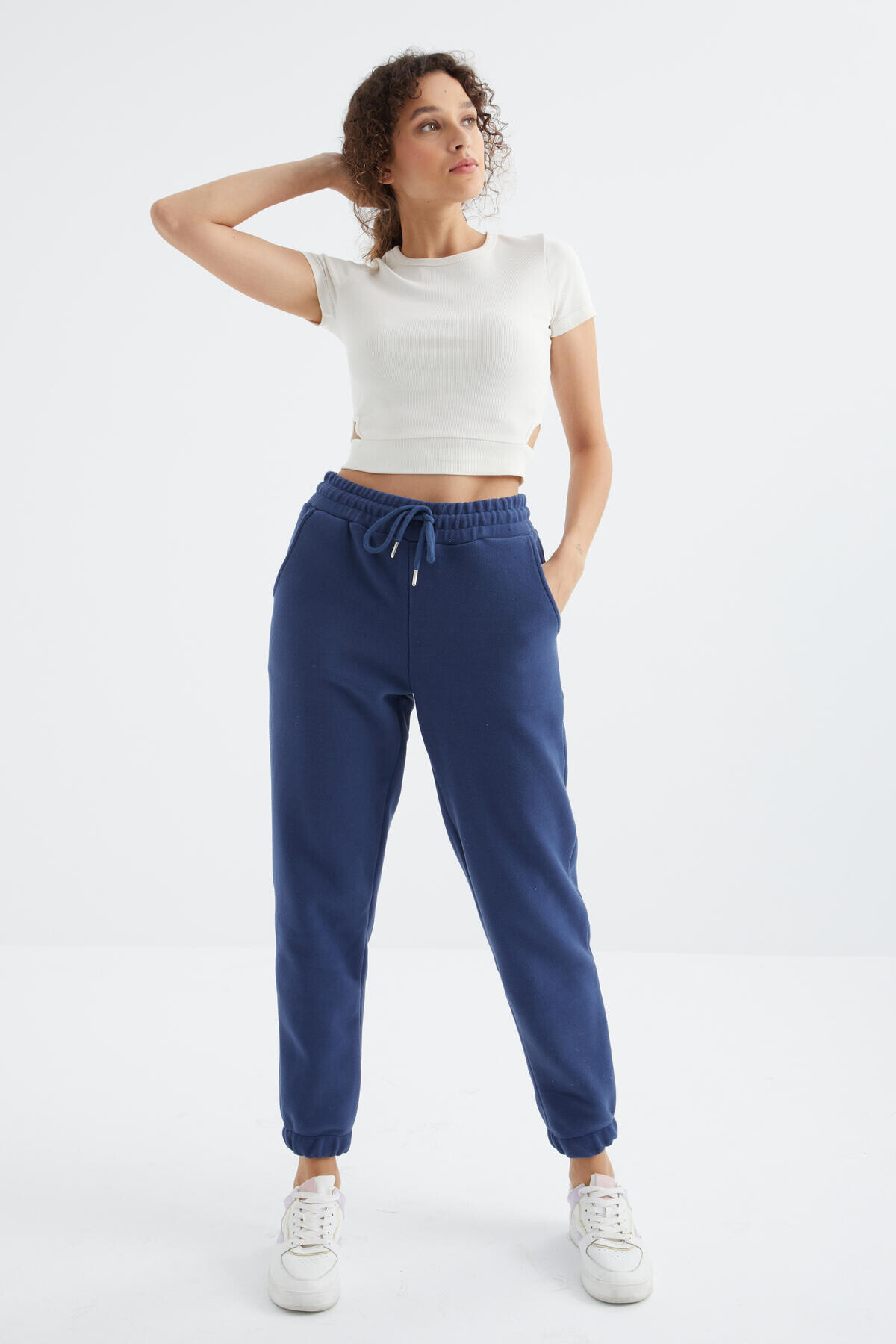 İndigo Yüksek Bel Basic Bağcıklı Jogger Polar Kadın Eşofman Alt yüksek bel, bağcıklı, jogger ve basic duruşa sahip olan model polar kumaşı ile seni soğuk kış aylarında sıcak tutacak ve birbirinden farklı stil seçeneği sunacaktır. Üzerinize giyebileceğiniz kapüşonlu sweatshirt modelleri, o yaka swetshirt ve hırka modelleri ile kombinleyebilirsin. Aksesualar ile tamamladığında günün her anında her yere gidebilecek kombininle dikkatleri üzerine sende çek.