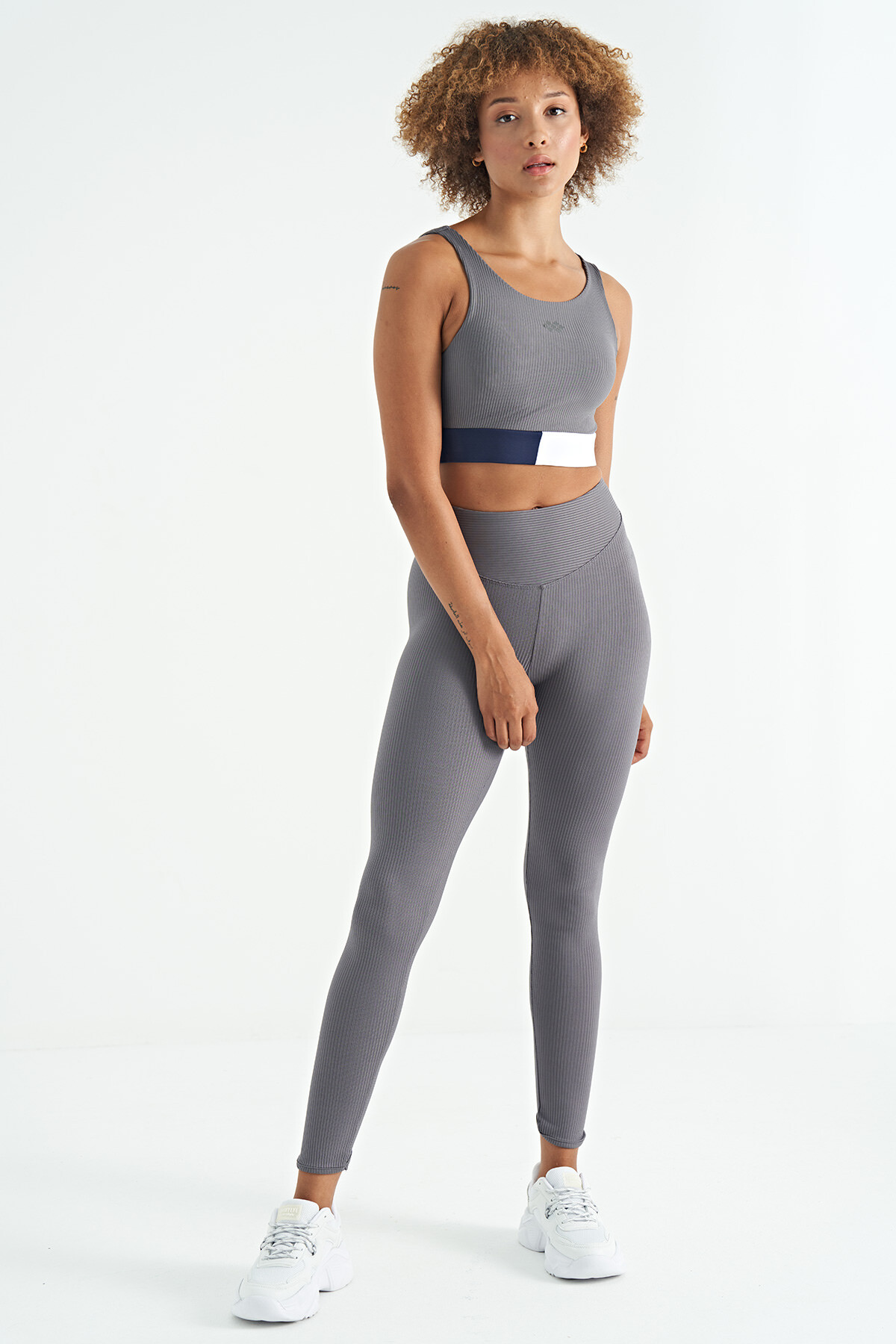 Koyu Gri Renk Bloklu Logo Baskılı Dar Kalıp Fitilli Kadın Büstiyer - 97275