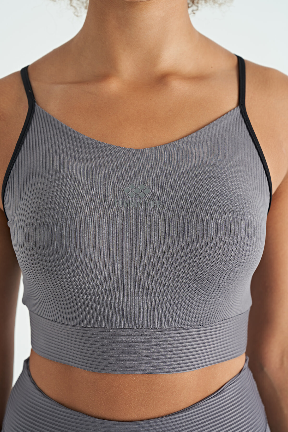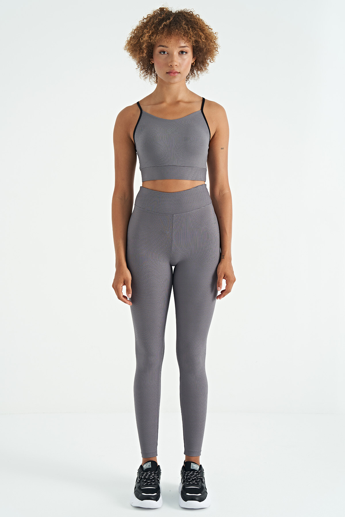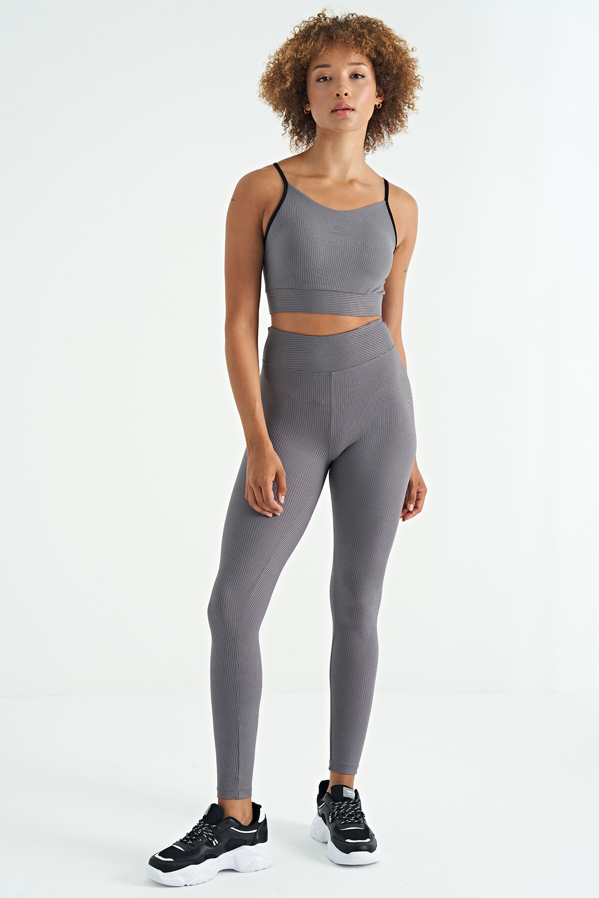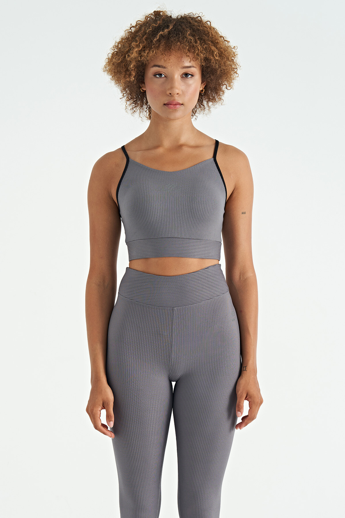 Koyu Gri Sırt Çapraz Detaylı Logo Baskılı Dar Kalıp Fitilli Kadın Büstiyer - 97274