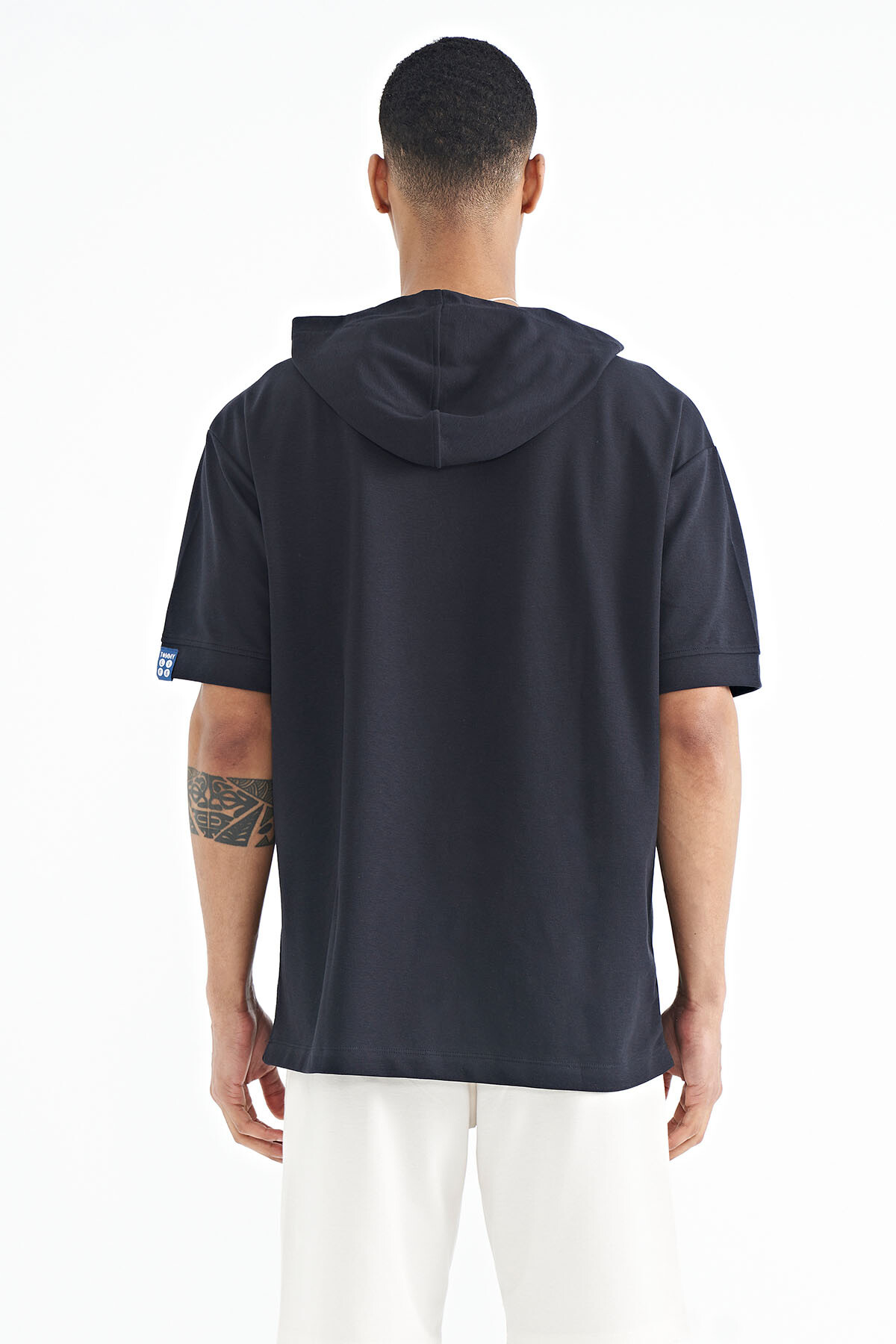 Lacivert Kapüşonlu Kol Etiket Detaylı Oversize Erkek T-shirt - 88179
