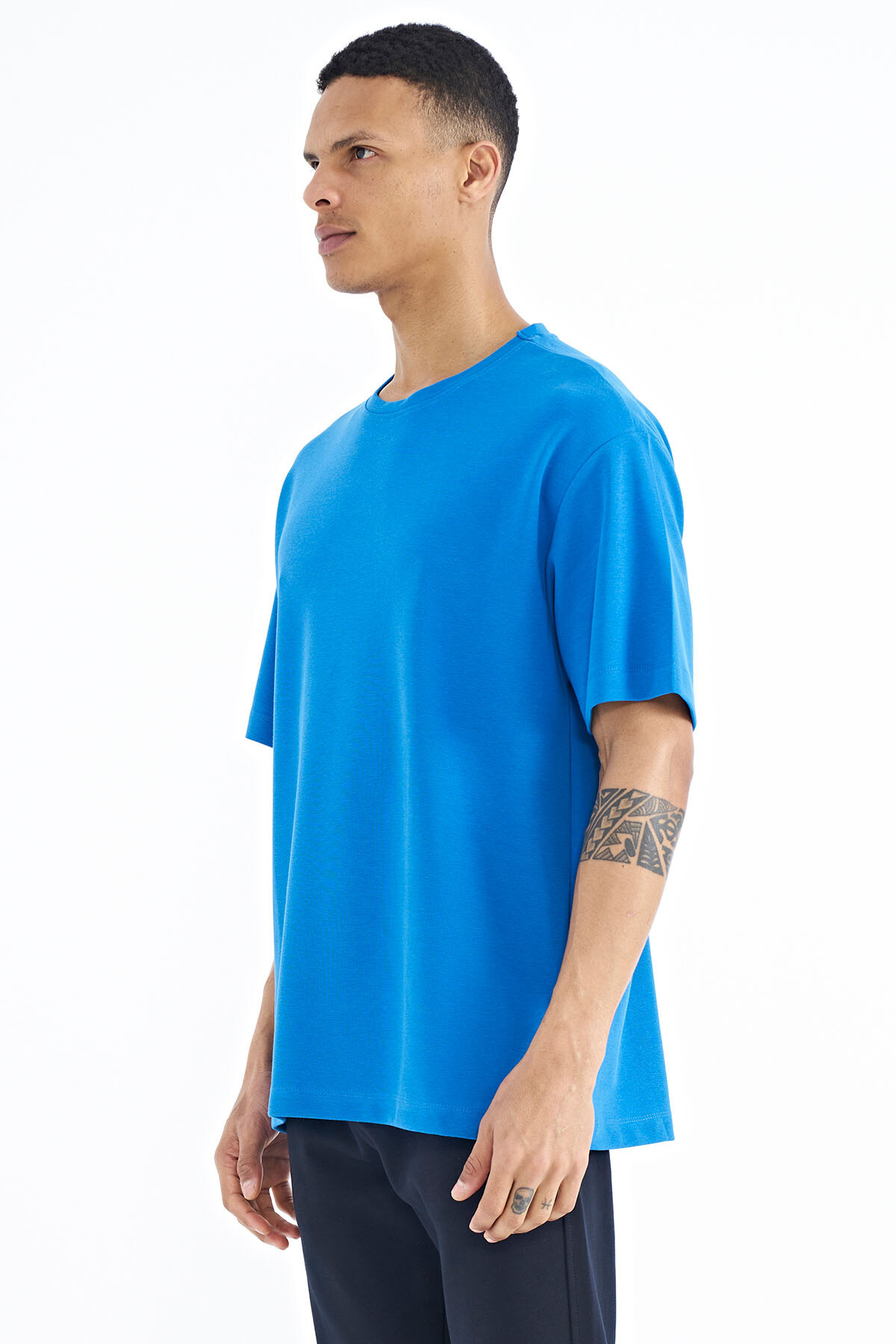 İndigo Kol Arma Detaylı Basic Oversize Erkek T-Shirt - 88193