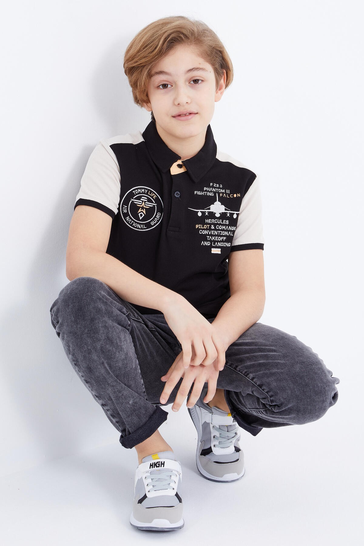 Siyah Nakış Detaylı Kısa Kollu Polo Yaka Erkek Çocuk T-Shirt klasik bir duruşa sahip olan model oğlunuzun gezmelerinde dolabından göz kırpacak. Nakış detayı, renklerin birleşimi t-shirt'e ayrı bir hava kazandırırken dar paça, geniş paça ve kot pantolonlarla güzel bir görünüm sunar. Bayramlarda, aile gezmelerinde tercih edeceği t-shirt'ü sipariş etmeyi unutmayın.
