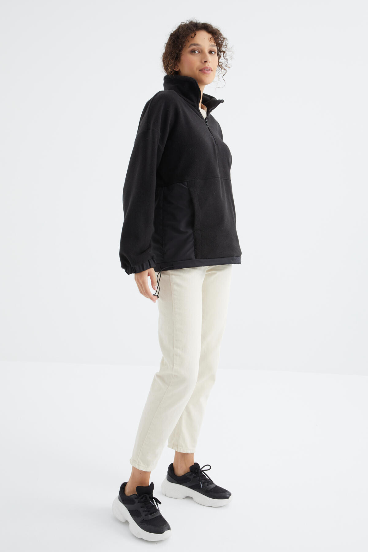 Siyah Yarım Fermuar Etek Ucu Büzgülü Dik Yaka Oversize Kadın Polar Sweatshirt dik yakası, etek ucu büzgüsü ve yarım fermuarlı tasarımı ile modaya uyum sağlayan model oversize duruşu ile seninle birlikte mükemmel tarzlara imzasını atmayı bekliyor. Soğuk kış aylarında polar kumaşı ile sıcakları iliklerine kadar hissettiren model jean pantolon, kargo pantolon, jogger pantolon, tayt ve eşofman modelleri ile rahatlıkla kombinlenebilir. Aksesuarlar ile stilini tamamladığında günün her anında değerlendirebilirsin.