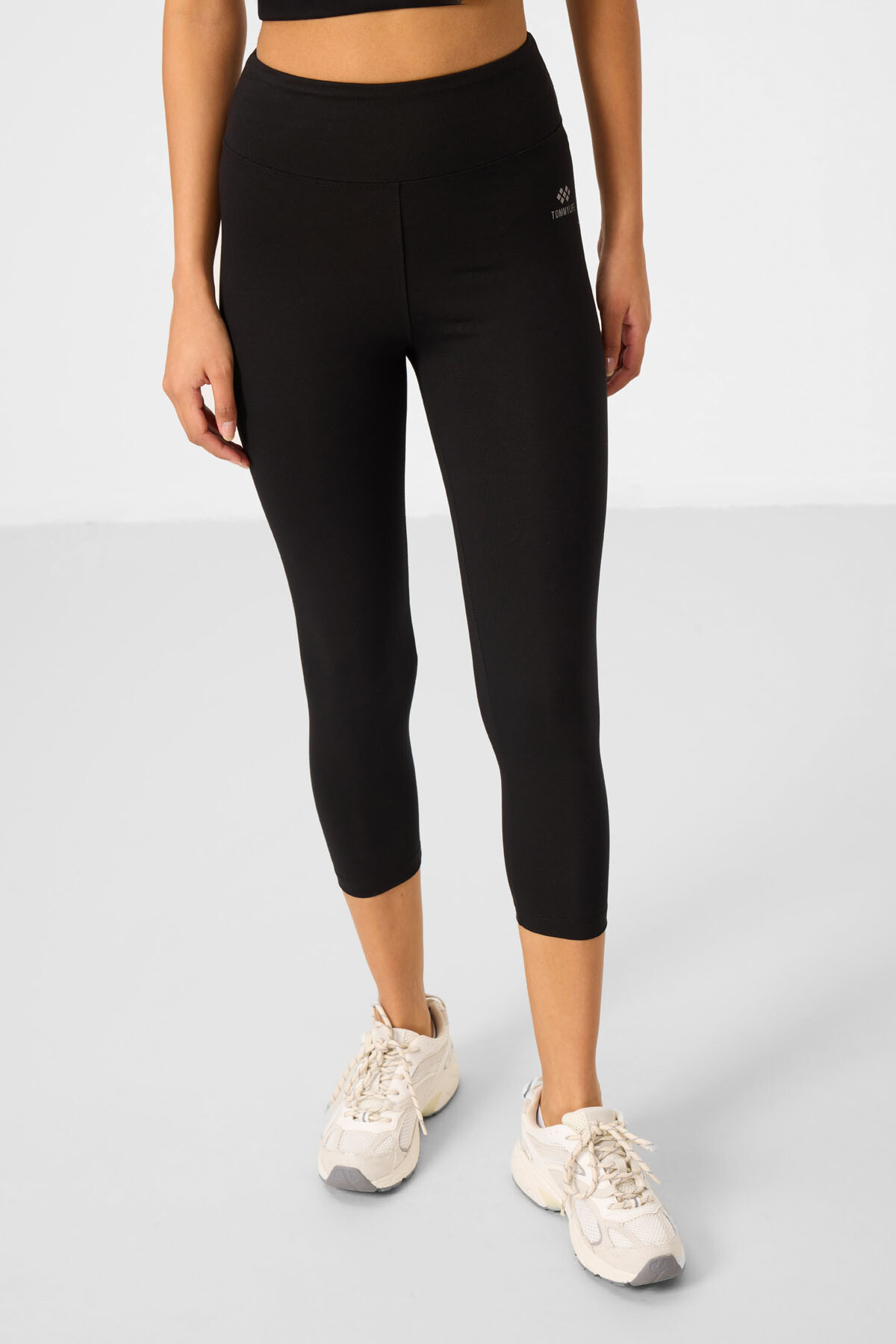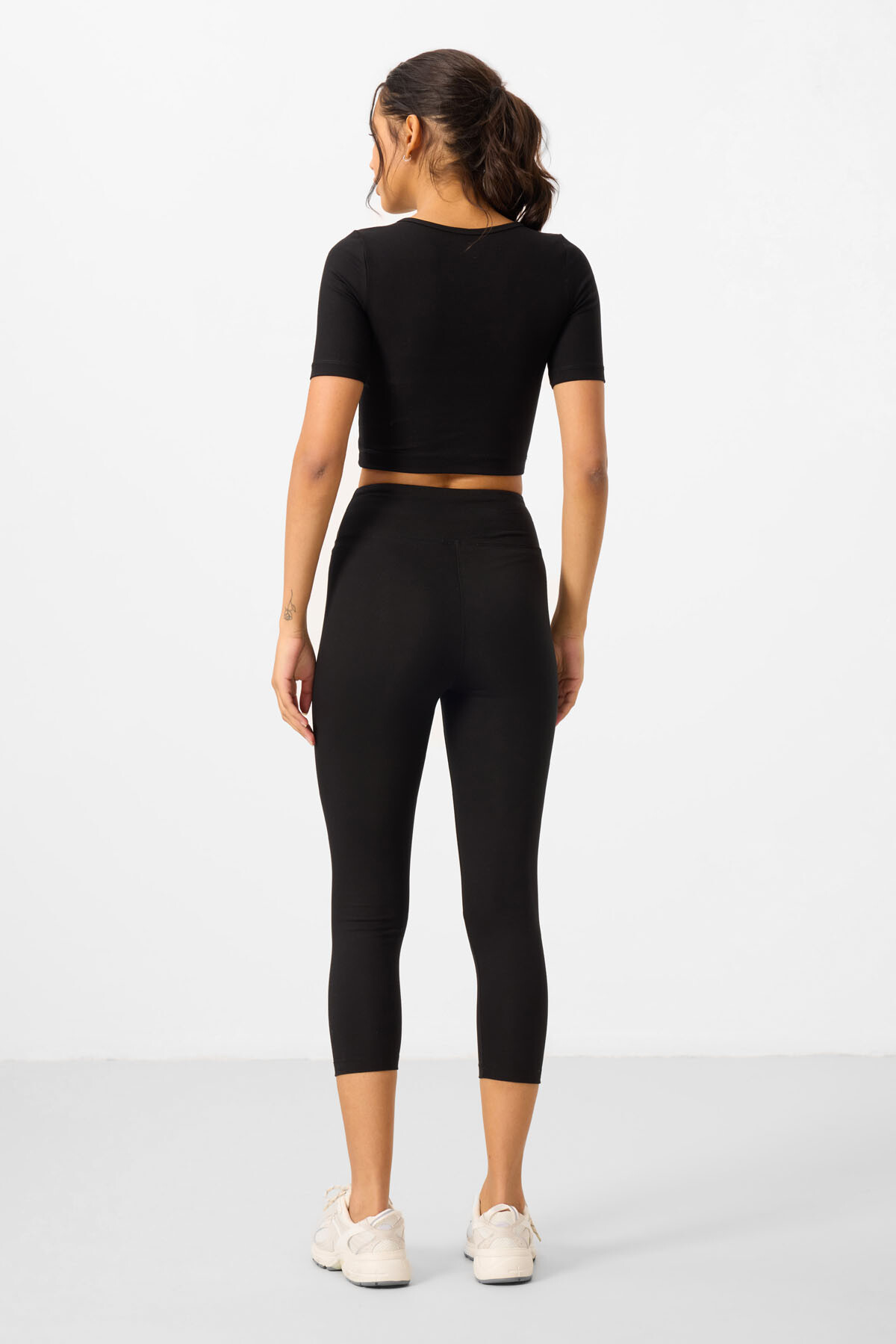 Siyah Yüksek Bel Kapri-Crop T-Shirt Slim Fit Kadın Tayt Takım, destekleyici ve yumuşak bir yapıya sahiptir. Yüksek bel yapısı ve geniş bel bandı basen bölgesini toparlayarak daha fit bir görünüm elde etmenizi sağlar. Özel olarak tasarlanan tasarım tayt takım pamuklu kumaştan üretilmiştir. Vücudu sararak daha esnek hareket etmenizi sağlar. Kapri model Tayt ve crop t-shirt top logo detayı ile dikkat çekiyor. Sol bel kısmında bulunan minimal logo bulunan üst, alt kapri tayt parça ayrıntıları ile tamamlanır.