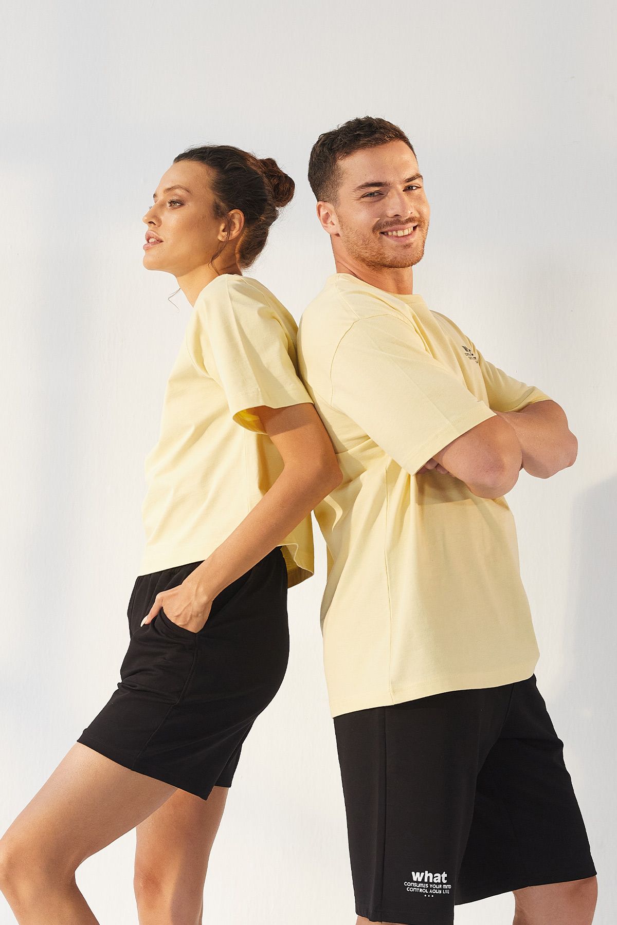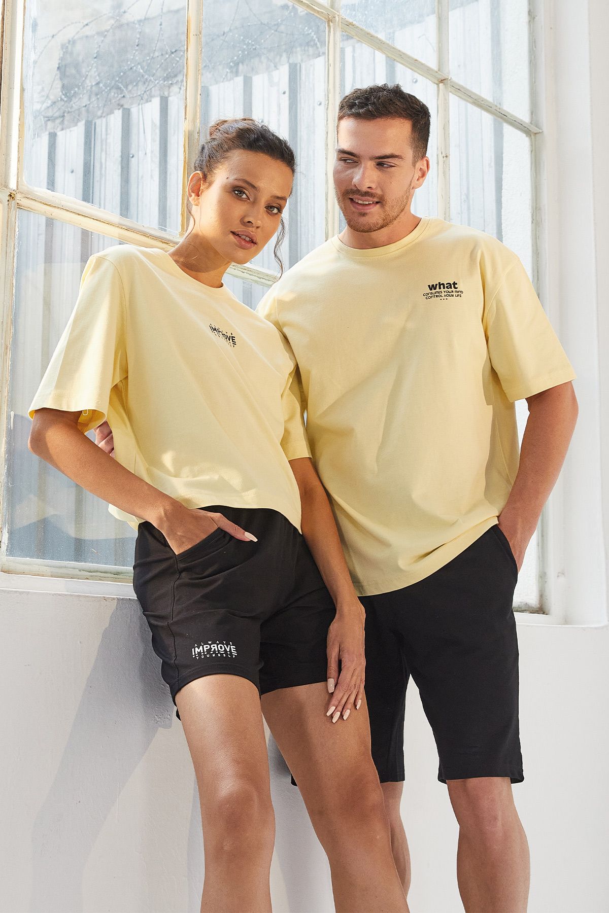 Ürün Kodu : 95292_54 - 85156_54Ürün Adı : Sarı-Siyah Küçük Yazı Baskılı O Yaka Oversize Bermuda Şort Takım Sevgili KombiniModelin Ölçüleri : Erkek - Boy : 1,85 Cm / Göğüs : 98 Cm / Bel : 80 Cm - M/38 / Kadın - Boy : 1.79 Cm / Göğüs : 86 Cm / Bel : 62 Cm / Kalça : 90 Cm - S/36Numune Bedeni : Erkek - M/38 Kadın - S/36Kumaş Bilgisi : %80 Pamuk %15 Polyester %5 ElastanMevsimi : YazÜrün Kalıp Bilgisi : OversizeÜrün Ölçüleri : Erkek - Alt: Yan Boy Kemer Dahil S Beden: 54 Cm / Bel: 35 Cm / Basen: 53,5 Cm - Üst: Omuzdan Boy: 72,5 Cm / Göğüs: 57 Cm / Kadın - Alt: Yan Boy Kemer Dahil S Beden: 43,5 Cm / Bel: 34 Cm / Basen: 52 CmPaket/Ürün İçeriği : Şort Takım