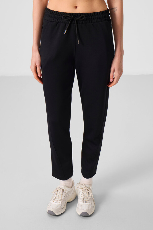 Günlük stilinize zarif bir dokunuş katmak istiyorsanız bu pantolon tam size göre. Siyah rengi, her parçayla kolayca uyum sağlar ve modern bir görünüm sunar. İnce detaylarla zenginleştirilmiş kesimi sayesinde hem rahat hem de şık bir duruş sağlar. Bel kısmındaki bağcık detayı kişisel uyum imkanı tanır. İster spor ayakkabıyla ister botlarla kombinleyin, her durumda stilinizi konuşturun.